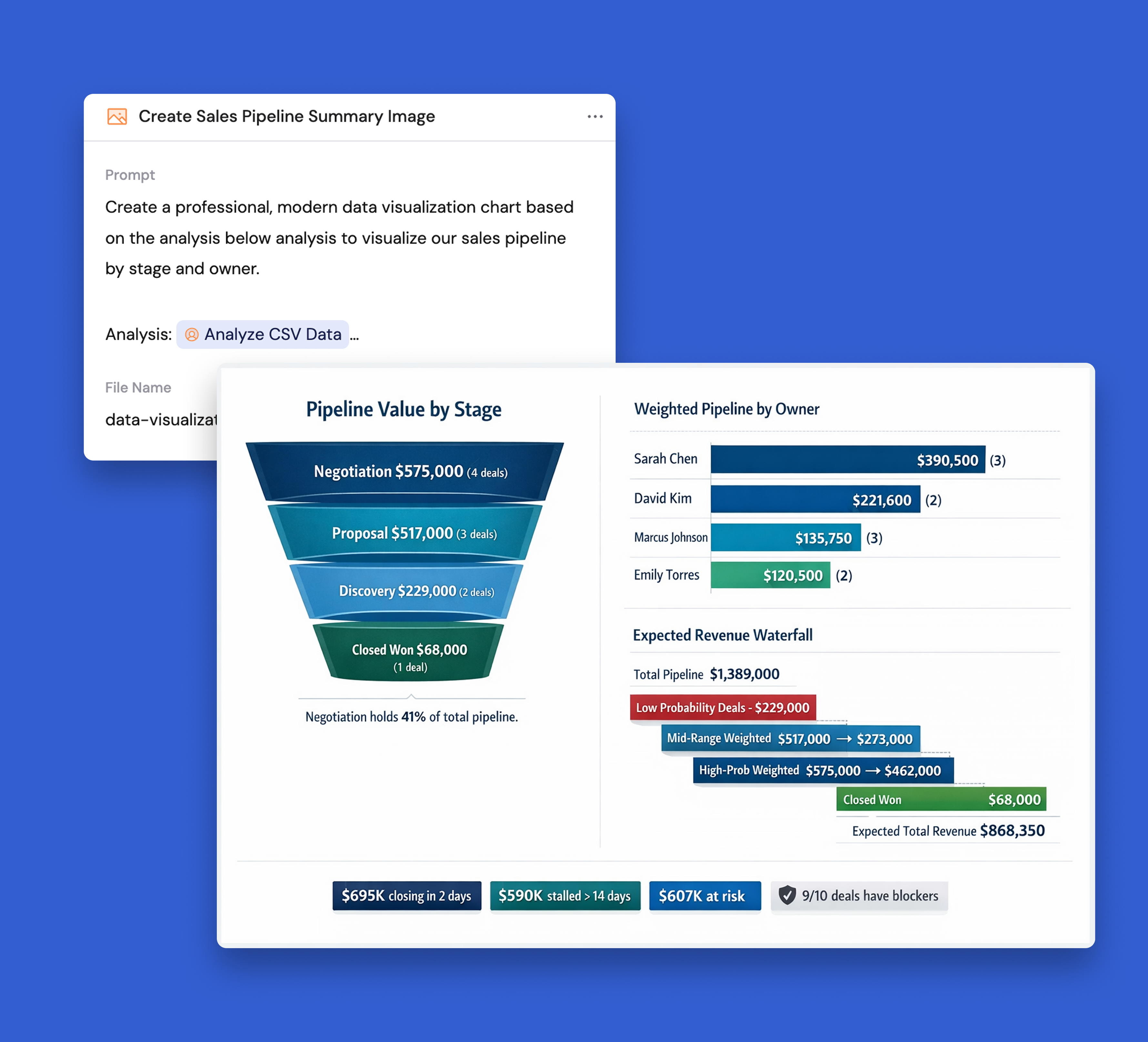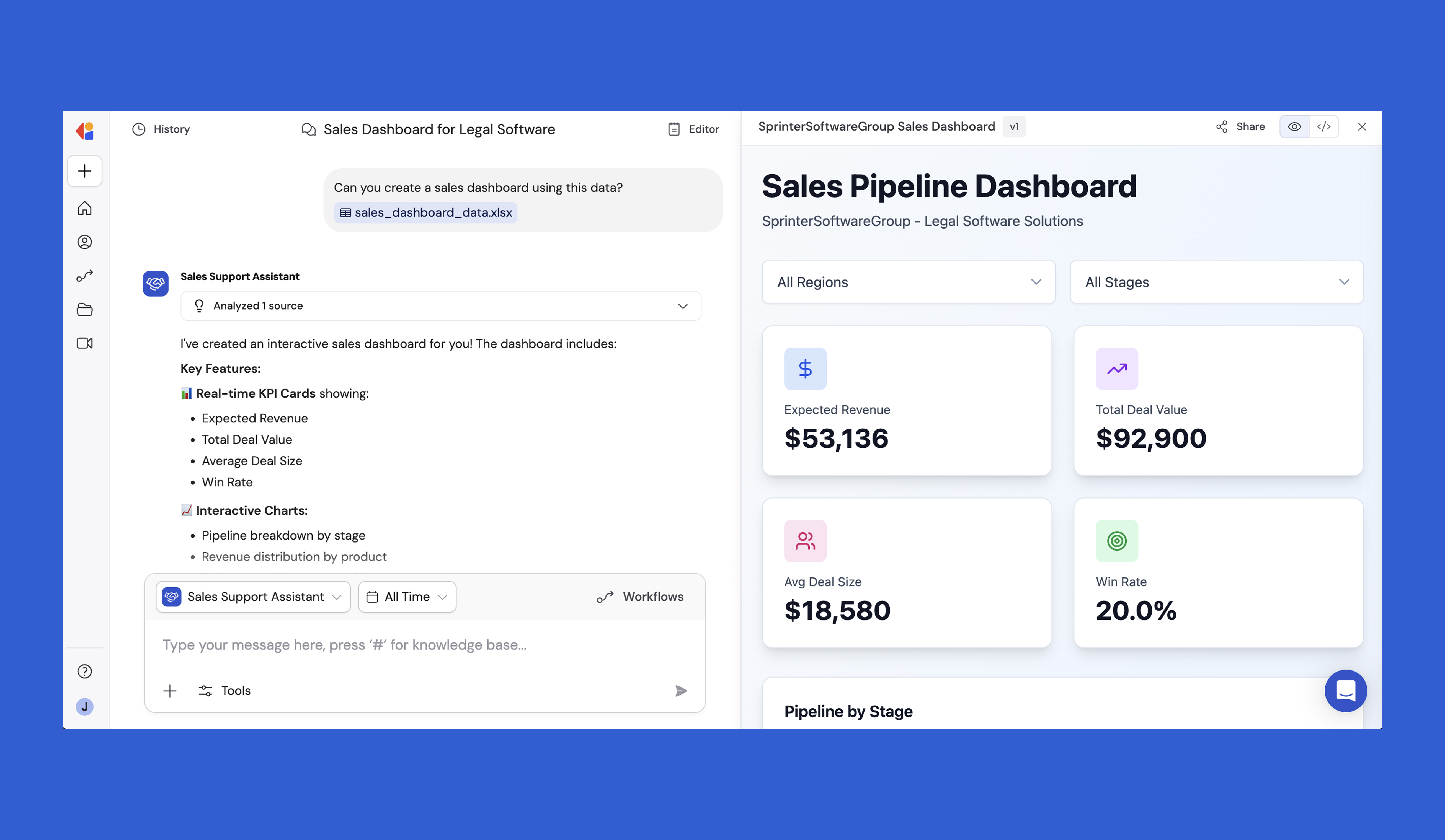 Generate charts, Word documents, PowerPoints, PDFs, Excel sheets, and more without leaving the conversation in Microsoft Teams & Slack.