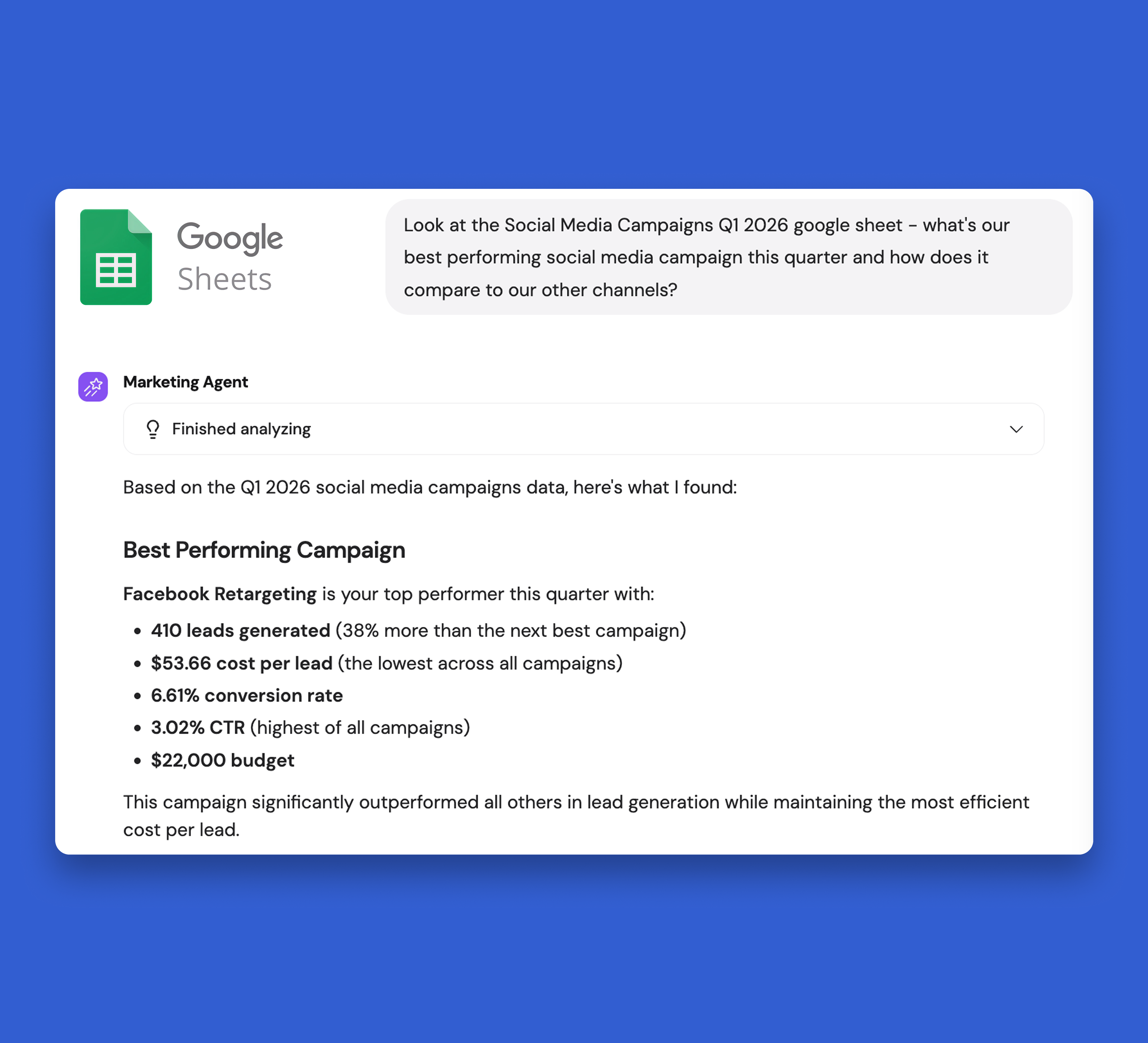 Teams can query Google Sheets in plain language to extract information quickly, with in-chat approvals for any actions that modify data.