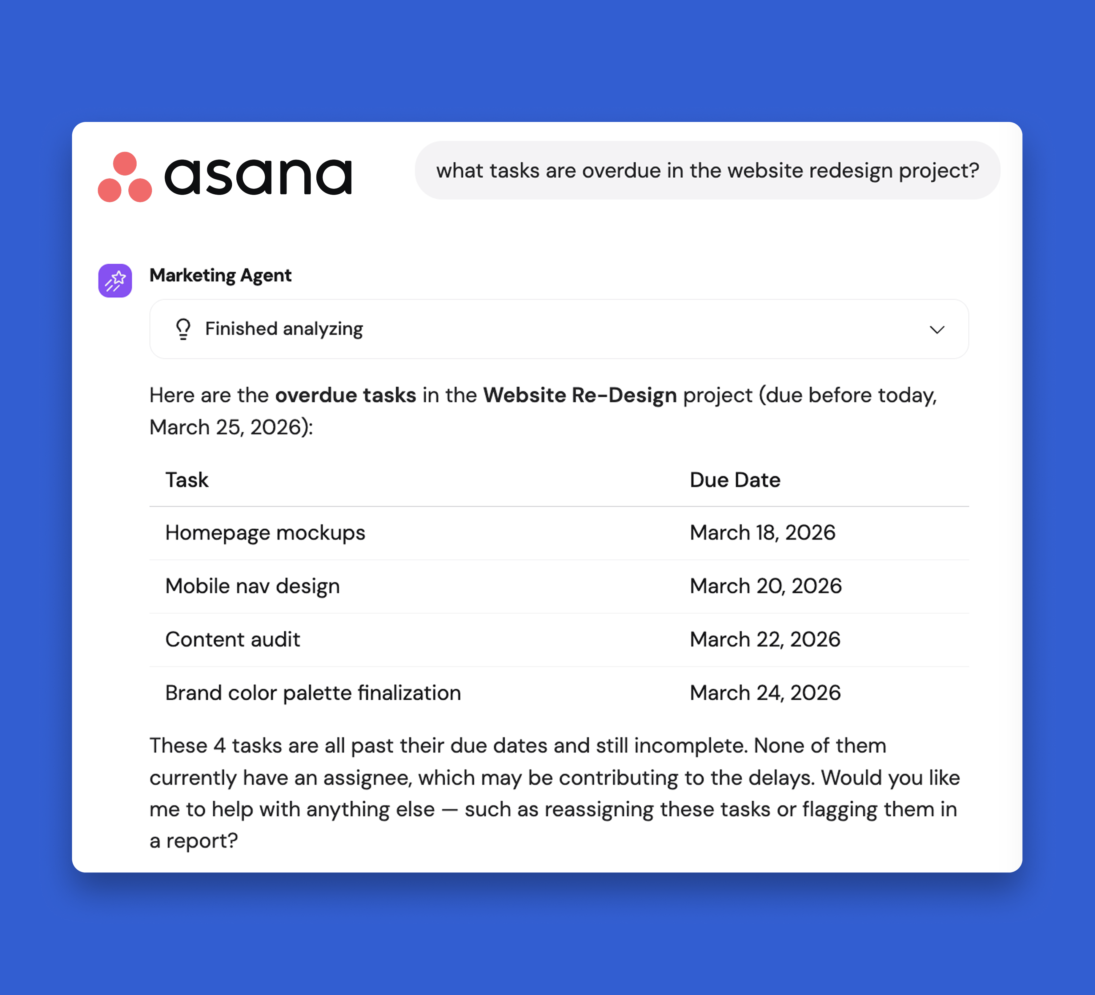 Teams can query Asana in plain language to extract information quickly, with in-chat approvals for any actions that modify data.
