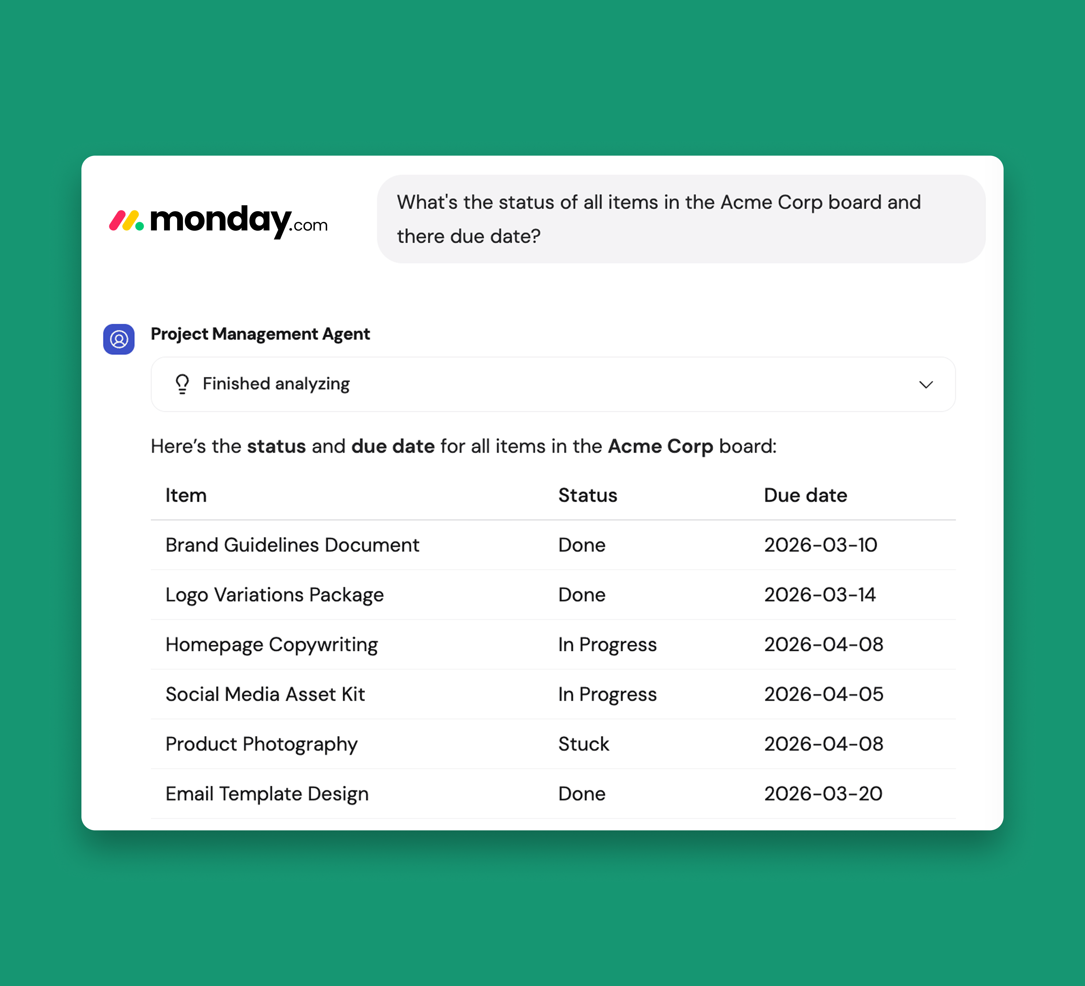 Teams can query monday.com in plain language to extract information quickly, with in-chat approvals for any actions that modify data.