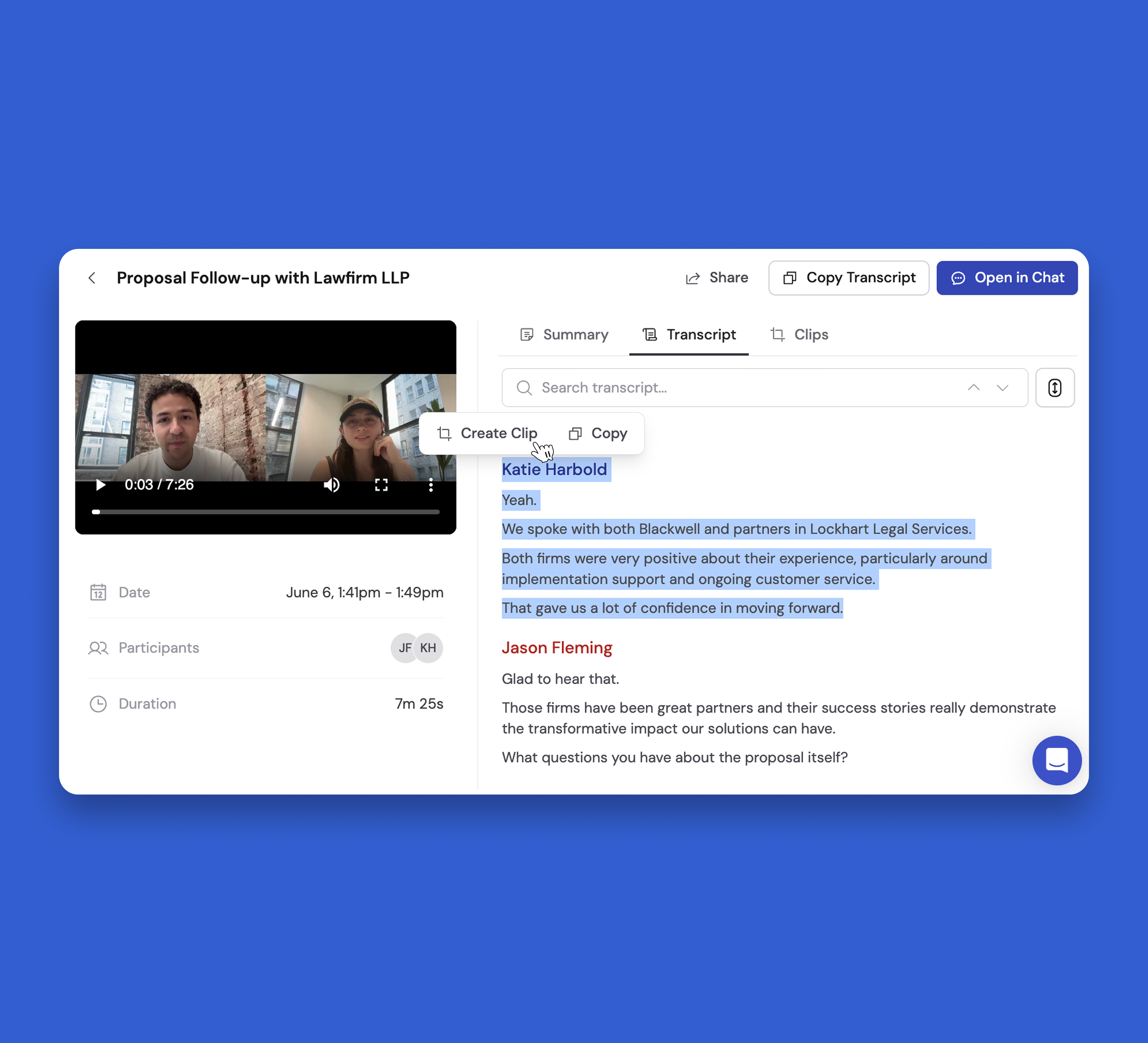 Clips have independent permissions from the original meeting—so even if a meeting is private, you can share specific clips with teammates who need them.