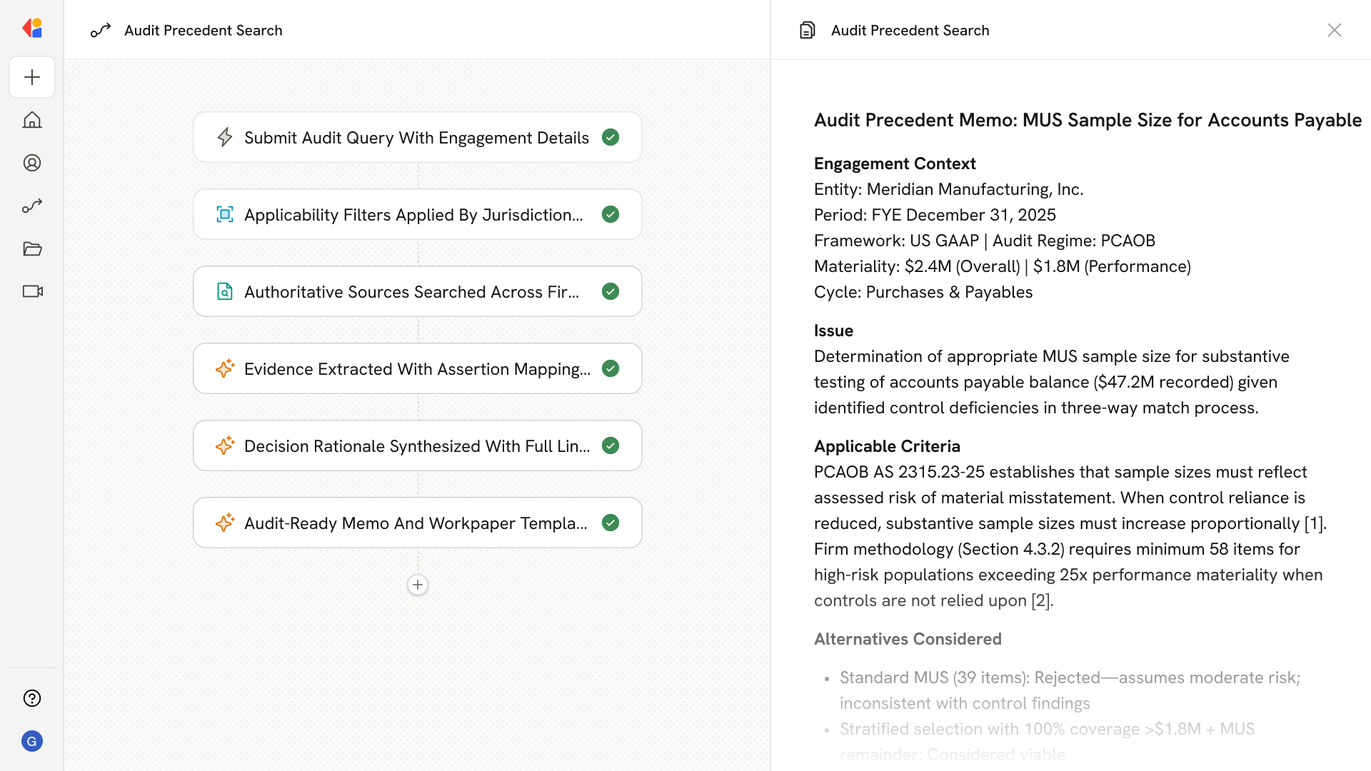 The Agent builds an audit-ready rationale trail: issue → applicable criteria → alternatives considered → judgment factors → selected approach → procedures → results → conclusion. Cross-references to workpapers, PBC items, and lead schedules are automatically populated.