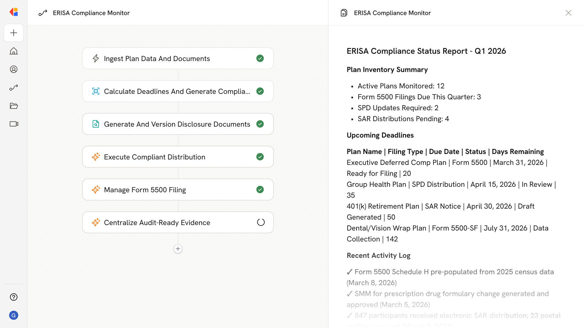The Workflow connects to your HRIS, payroll, benefits administration platforms, and carrier feeds to import your complete ERISA plan inventory—including plan documents, prior Form 5500 filings, SPDs, SMMs, and participant census data.