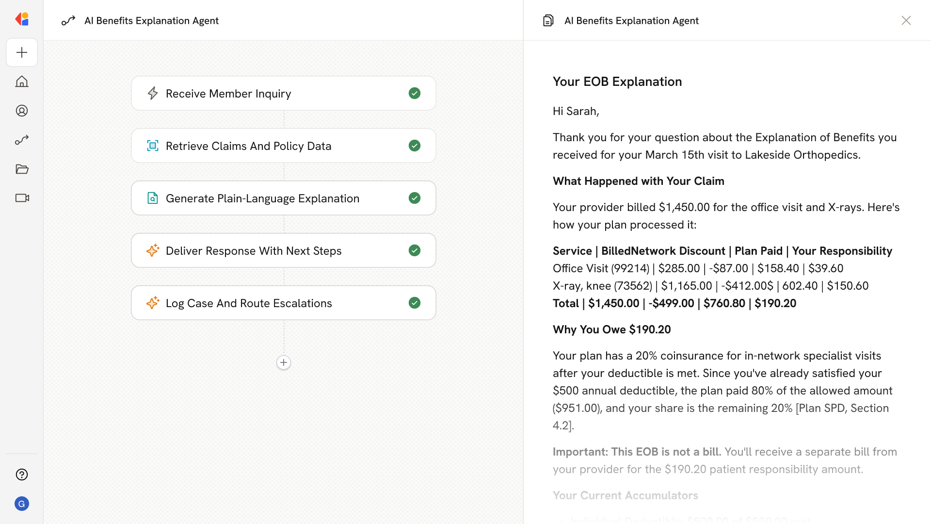 The Agent reasons through the adjudication logic deductible application, coinsurance calculations, network discounts, and denial reasons to produce a plain-language explanation with line-item math and expandable citations to plan documents.
