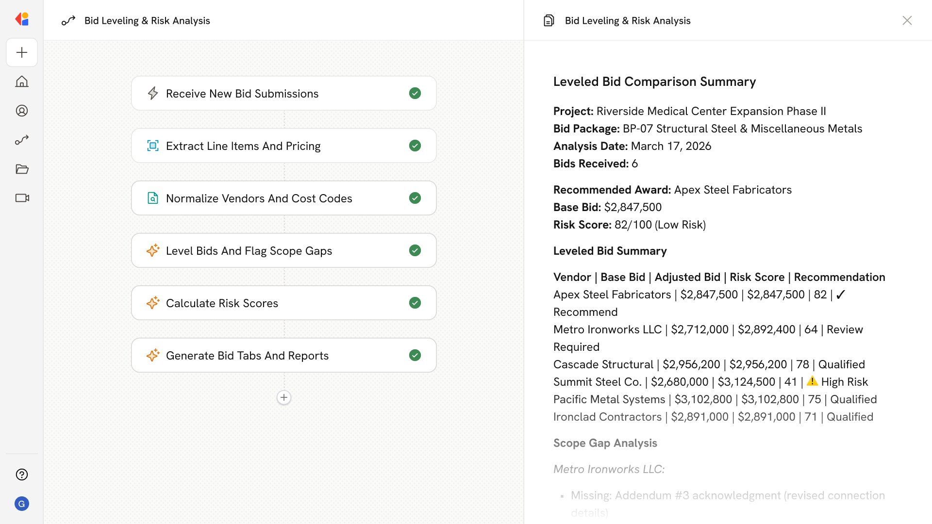 The system computes per-bid and per-vendor risk scores based on scope completeness, price variance, compliance gaps, and historical performance, surfacing outliers and missing addenda before bid day pressure hits.
