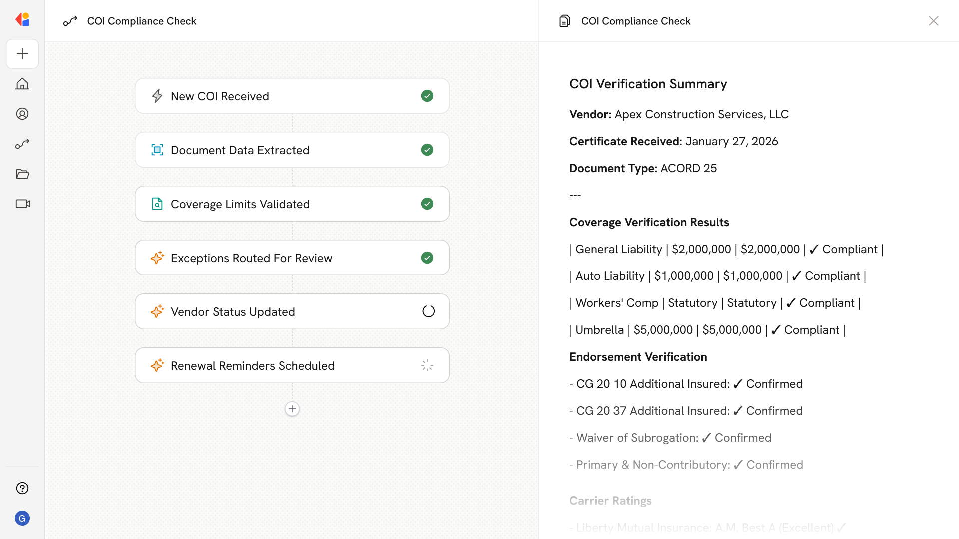 The Workflow applies your insurance rules—checking GL/Auto/WC limits, verifying endorsements like CG 20 10 and CG 20 37 for additional insured status, confirming carrier A.M. Best ratings, and flagging prohibited exclusions.