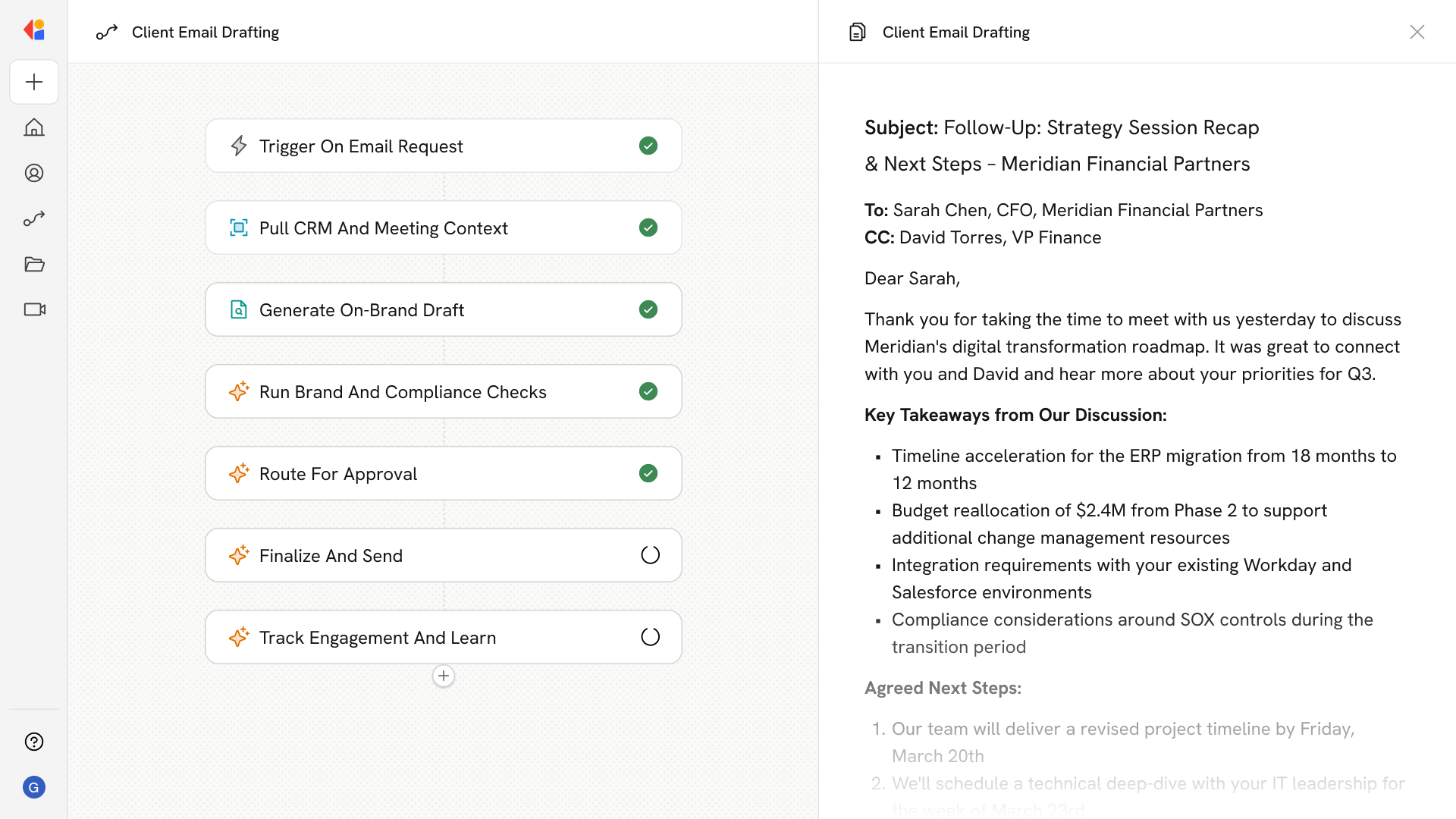 The Workflow activates when a relationship manager initiates a client communication—selecting the use case (meeting recap, QBR invite, proposal transmittal, or renewal notice) and specifying recipients from the CRM.