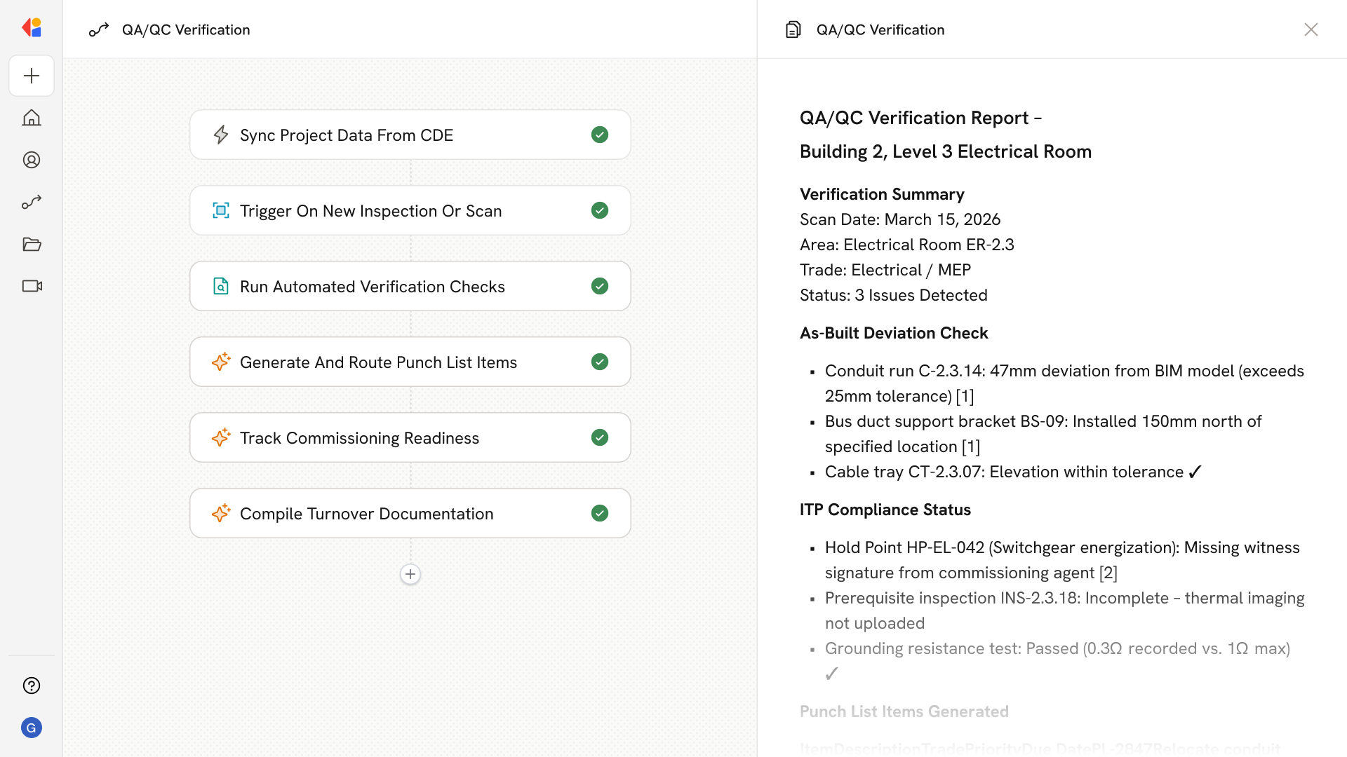 The Workflow activates when a new inspection record is submitted, a 360 photo walk is uploaded, or a laser scan is registered—ensuring verification happens in real time as work progresses.