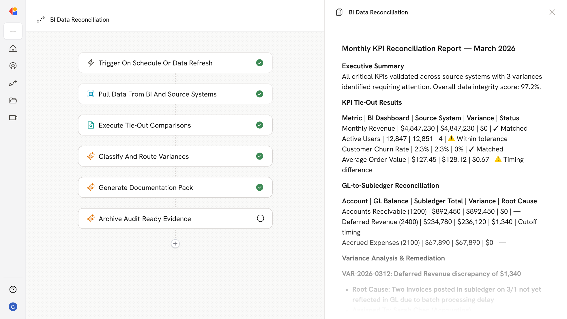 The agent automatically compares BI metrics against source systems, subledgers, and GL control accounts, flagging variances that exceed your materiality thresholds without spreadsheet wrangling.