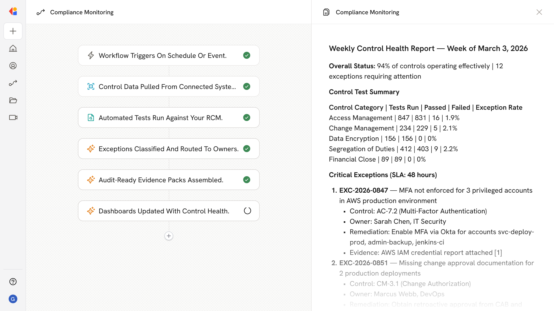 When control failures occur, the system classifies exceptions by severity, routes them to the right owners with SLAs, and tracks remediation through resolution—reducing manual coordination and accelerating time-to-fix.