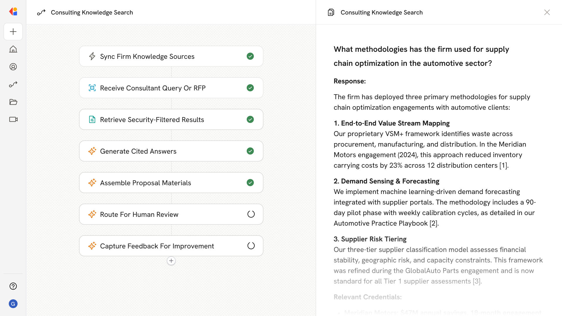 Every response is generated from retrieved firm content with inline citations linking to exact slides, sections, and documents, while matter-level security trimming ensures consultants only access what they're entitled to see.