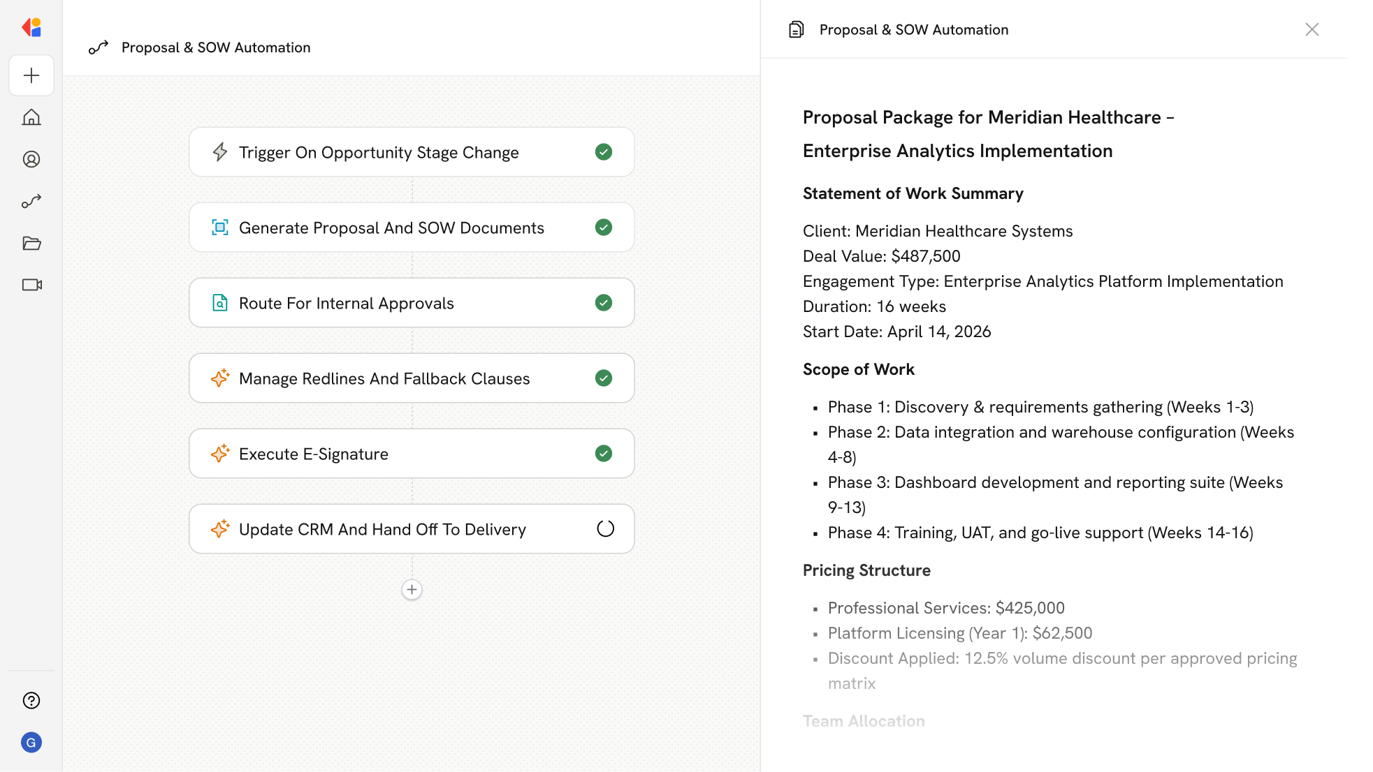 The agent pulls opportunity details, pricing, and client information directly from the CRM to generate accurate, on-brand proposals and SOWs—no copy-paste errors or outdated templates.