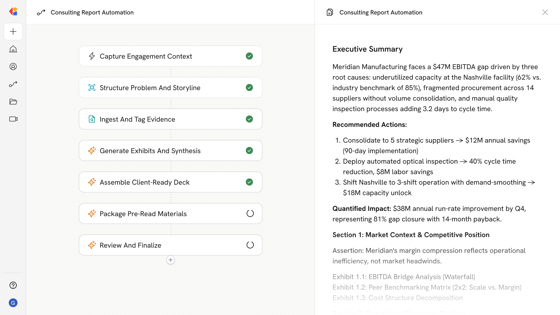 The Workflow compiles an executive summary (answer-first, quantified impact, call to action), storylined sections with assertion titles, and a sourced appendix—all formatted to your slide master with consistent headers, footers, and exhibit numbering.