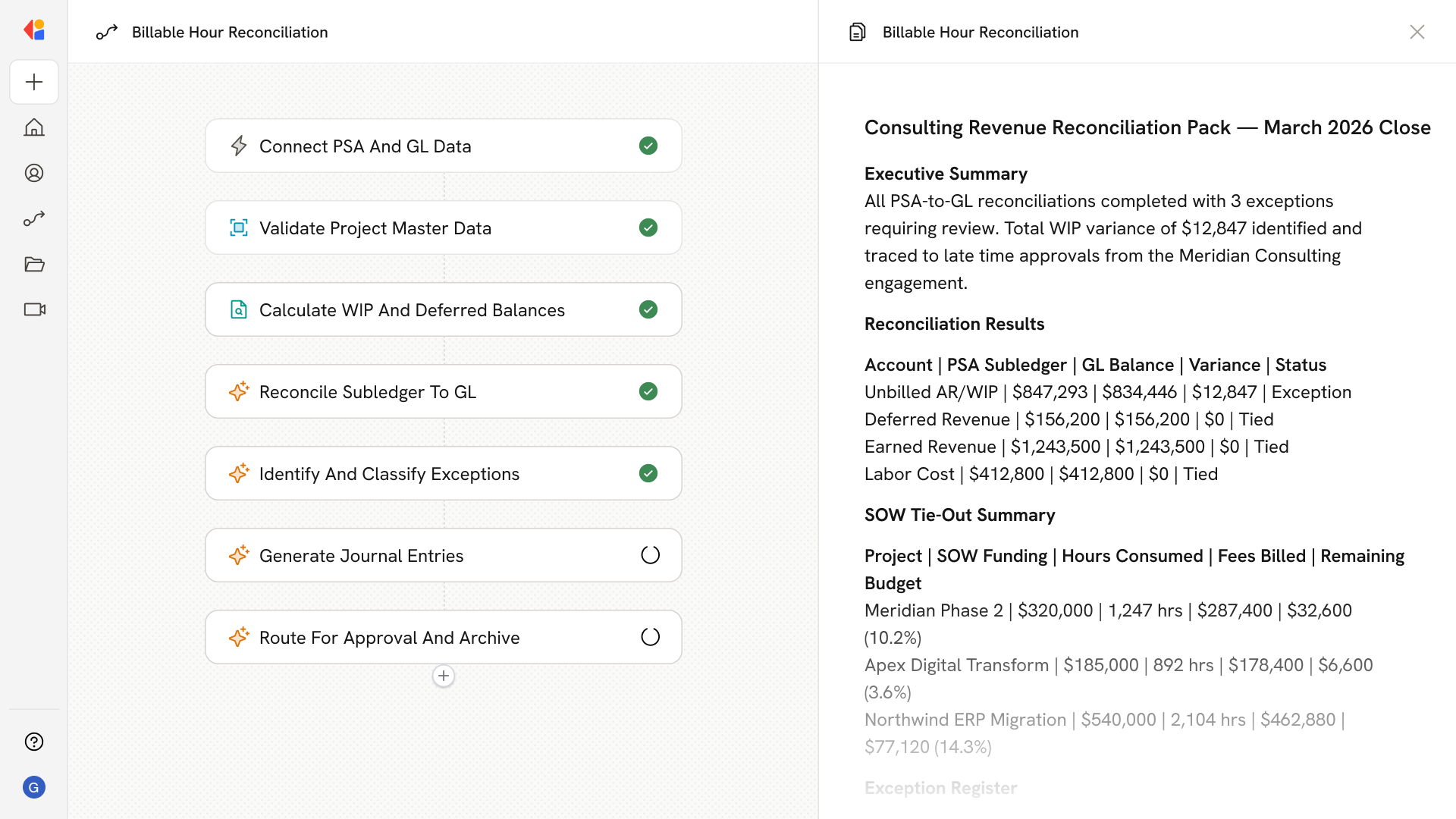 The agent connects directly to your PSA and ERP systems, automatically reconciling subledger activity to GL balances by account and dimension—replacing error-prone VLOOKUPs with traceable, audit-ready schedules.