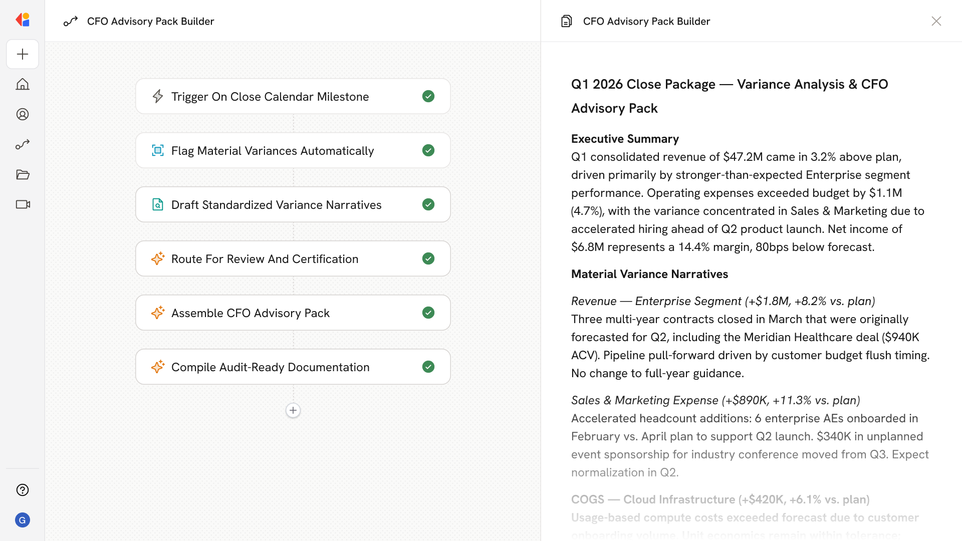 The Workflow activates automatically when your close calendar signals a key milestone—such as period lock, trial balance load, or flux analysis due date—pulling data from your ERP, subledgers, and FP&A tools.