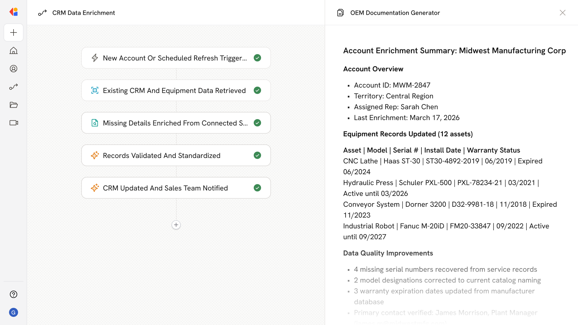 AI automation continuously monitors for changes in equipment status, warranty expirations, and maintenance schedules, then updates CRM records in real time so reps always work from accurate information.