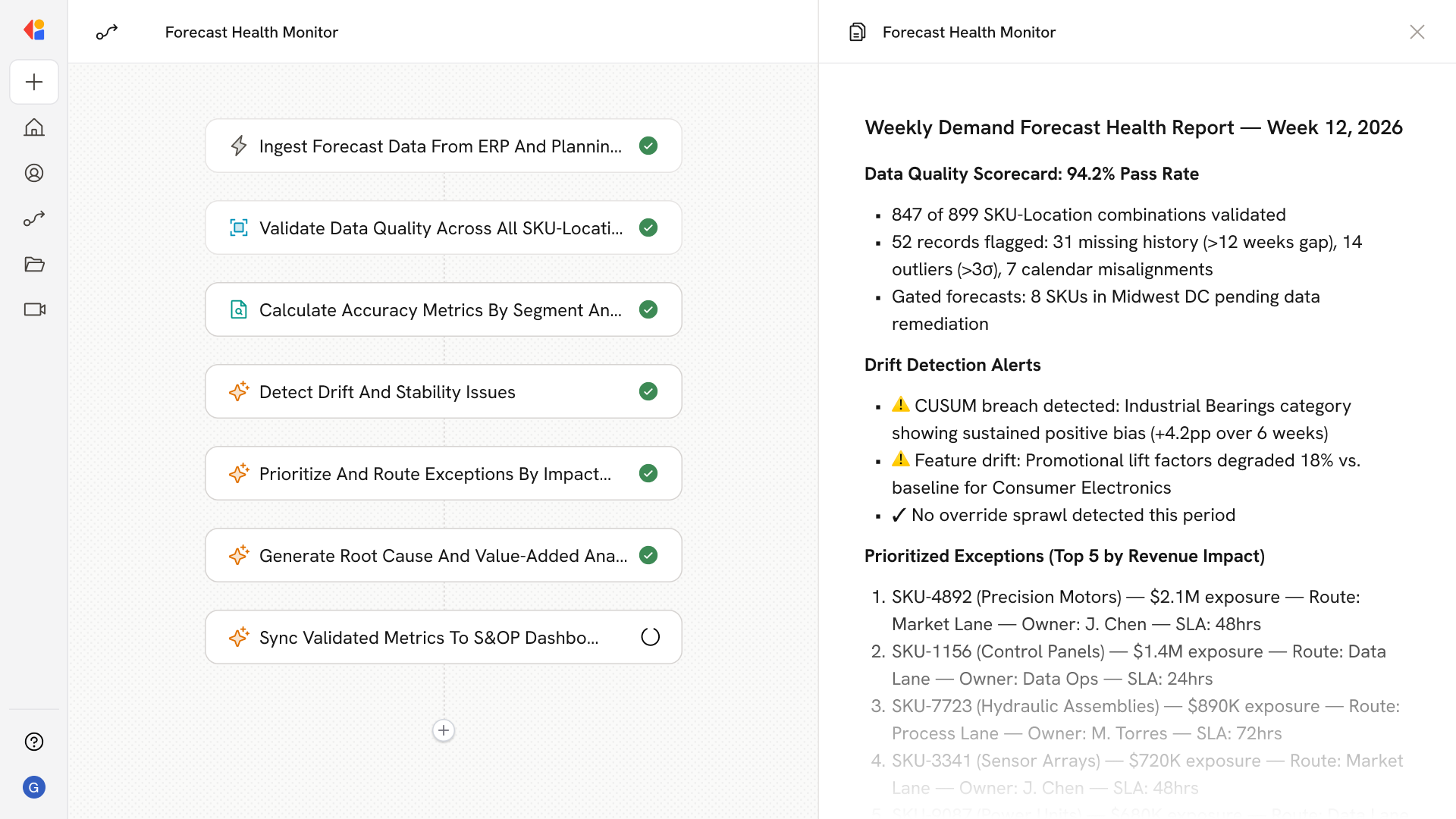 Validated metrics and prioritized exceptions feed directly into your Demand Review. Cassidy logs all decisions for audit, schedules retraining when drift thresholds breach, and updates playbooks—keeping planners focused on the highest-impact work.