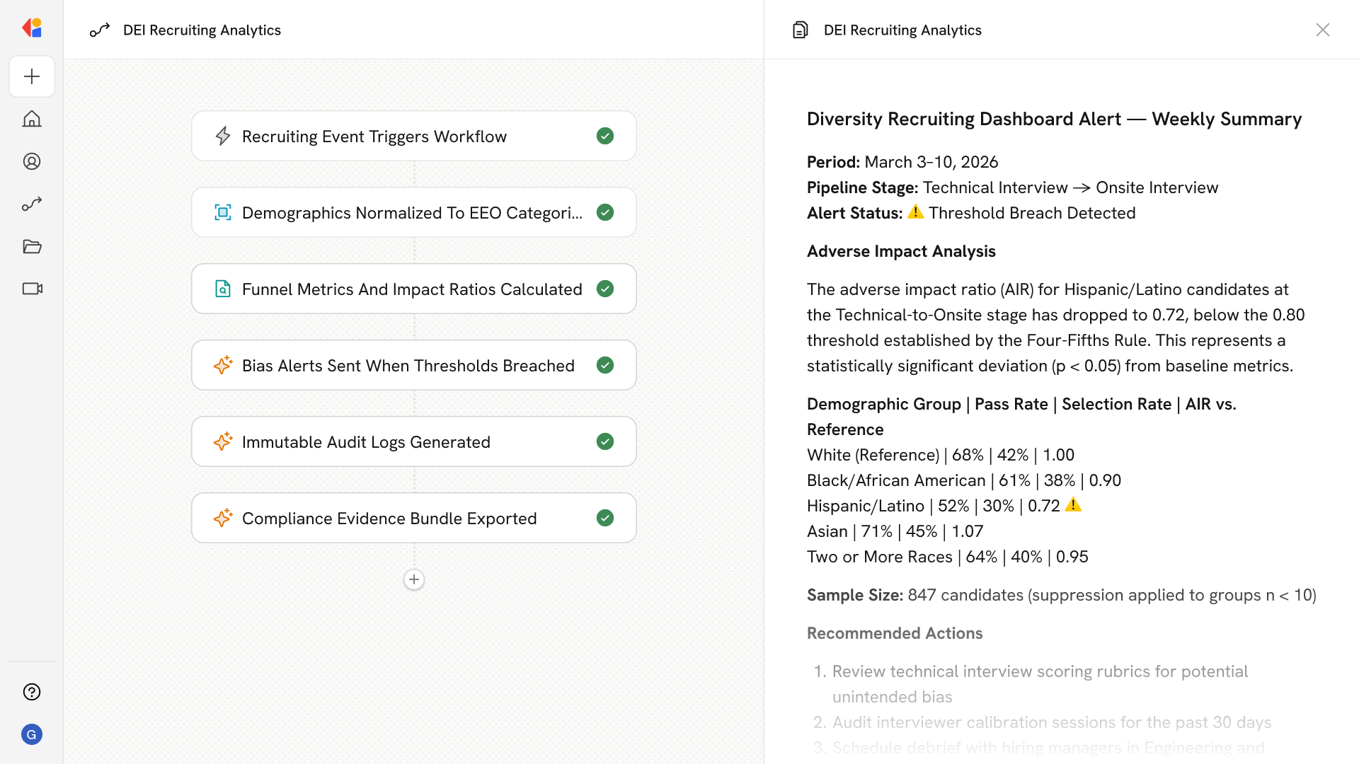 The agent continuously computes stage-by-stage selection rates by demographic group, flags adverse impact ratios below the four-fifths threshold, and surfaces statistically significant deviations with confidence intervals—giving DEI hiring teams immediate visibility into where bias may be entering the pipeline.
