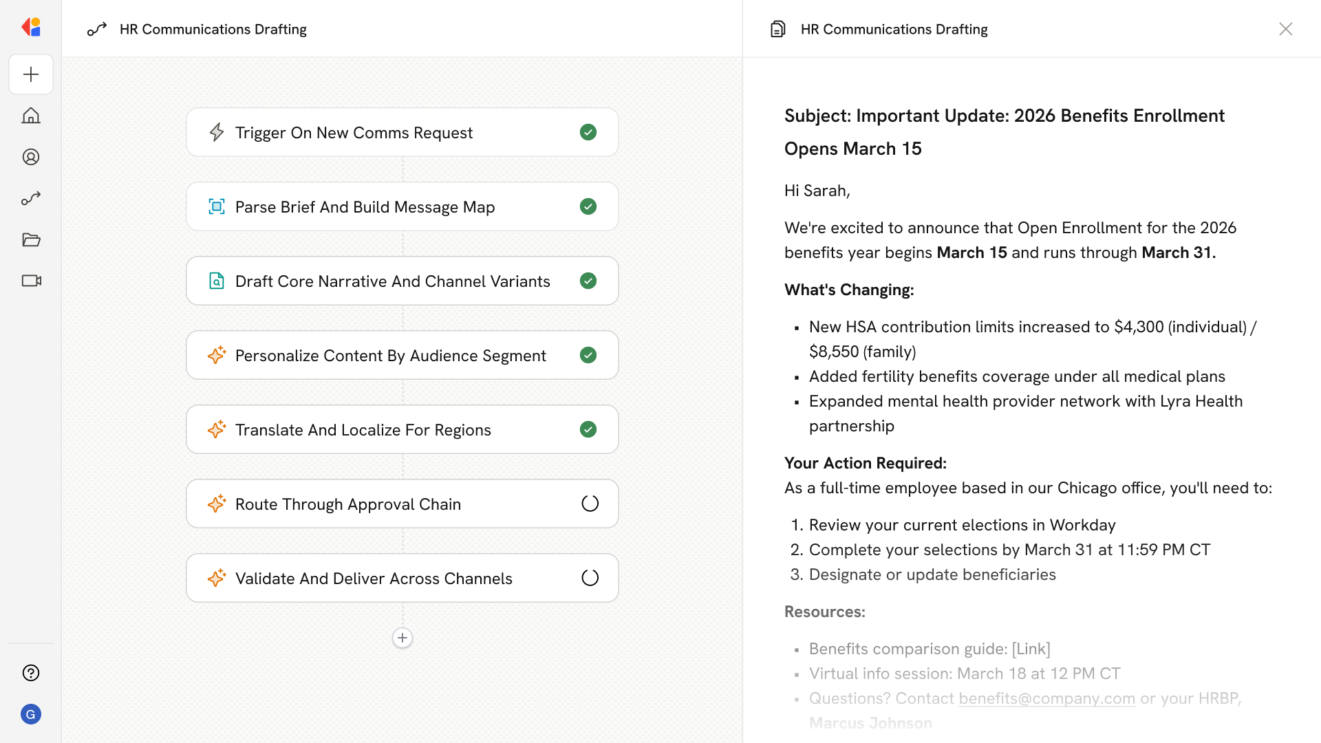 The agent generates core narratives and channel-specific variants—emails, intranet posts, Slack messages, manager talk tracks—using your tone guidelines, reading-level standards, and inclusive language rules.