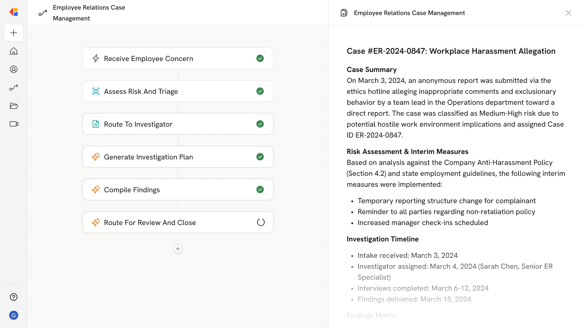 AI-guided workflows embed your policies, jurisdictional rules, and escalation paths directly into every case—ensuring investigators follow standardized procedures and apply the same standards of proof across all allegations.