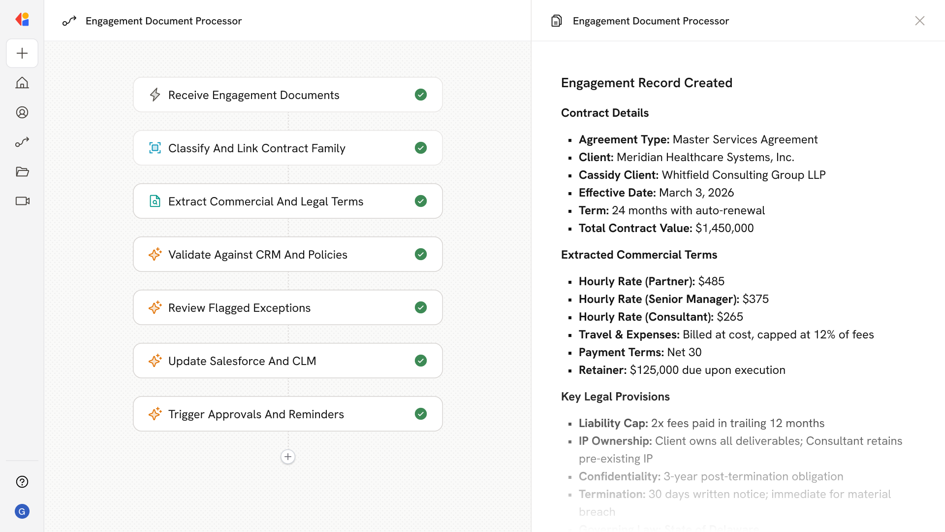 The Agent pulls key fields from the Knowledge Base-informed extraction model: party names, effective dates, fee structures, rate cards, liability caps, IP terms, milestones, and engagement-specific metadata like practice line and partner assignments.