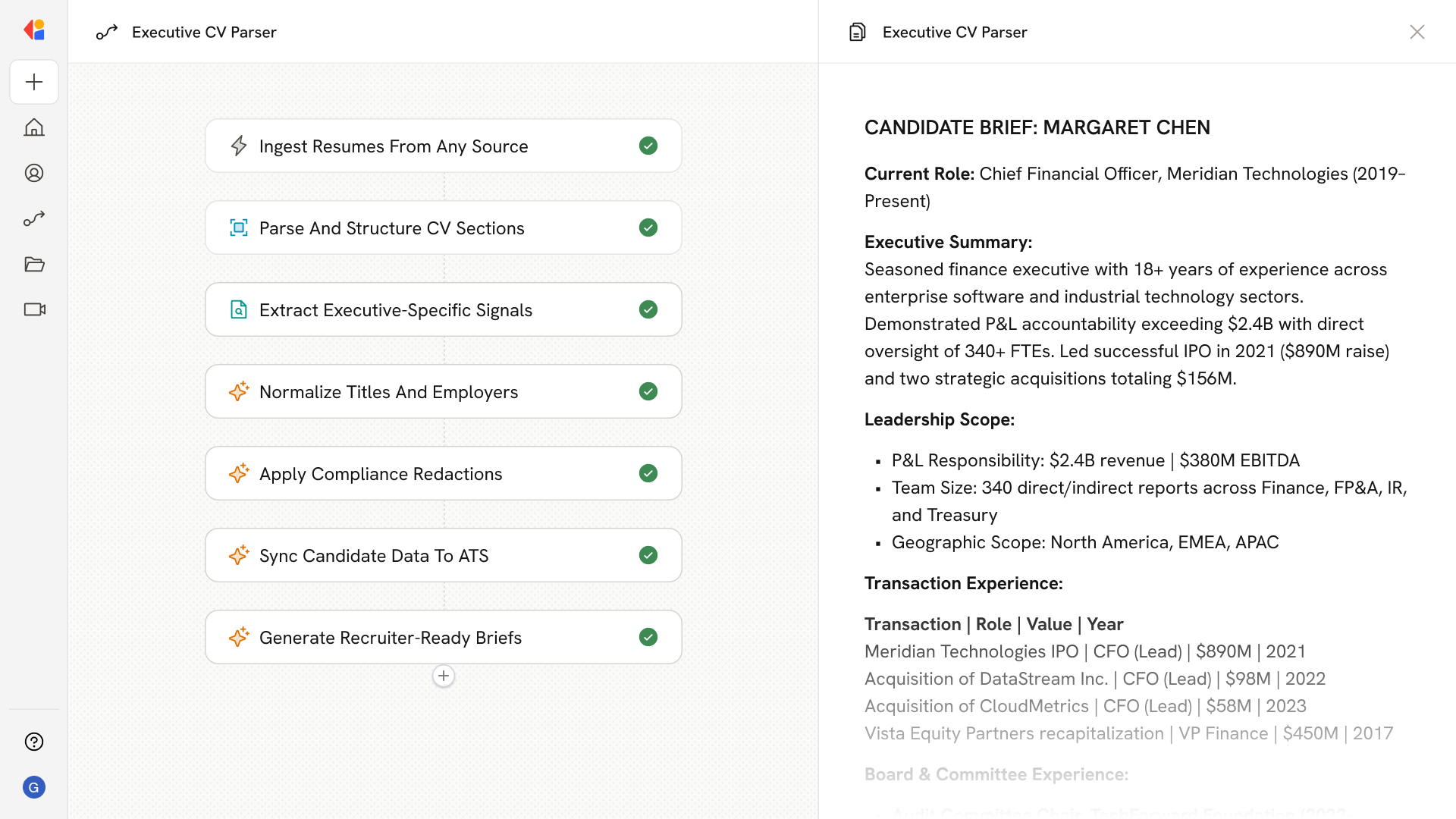 The agent handles multi-column layouts, transaction tables, board role listings, and scanned PDFs with OCR—extracting 100+ structured fields from even the most complex C-suite resumes.