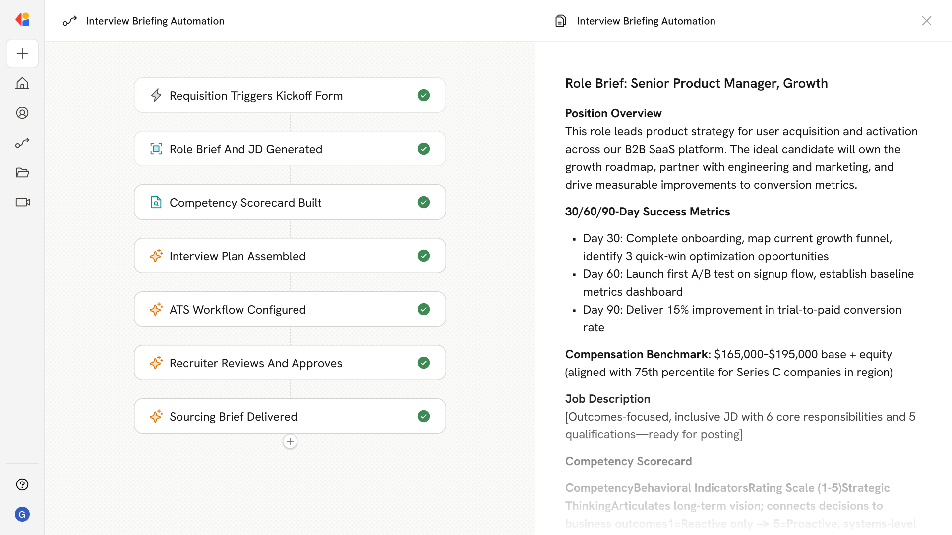 The Workflow creates a template job in your ATS with preconfigured stages, interviewer assignments, SLAs, email templates, and feedback nudges—eliminating manual setup.