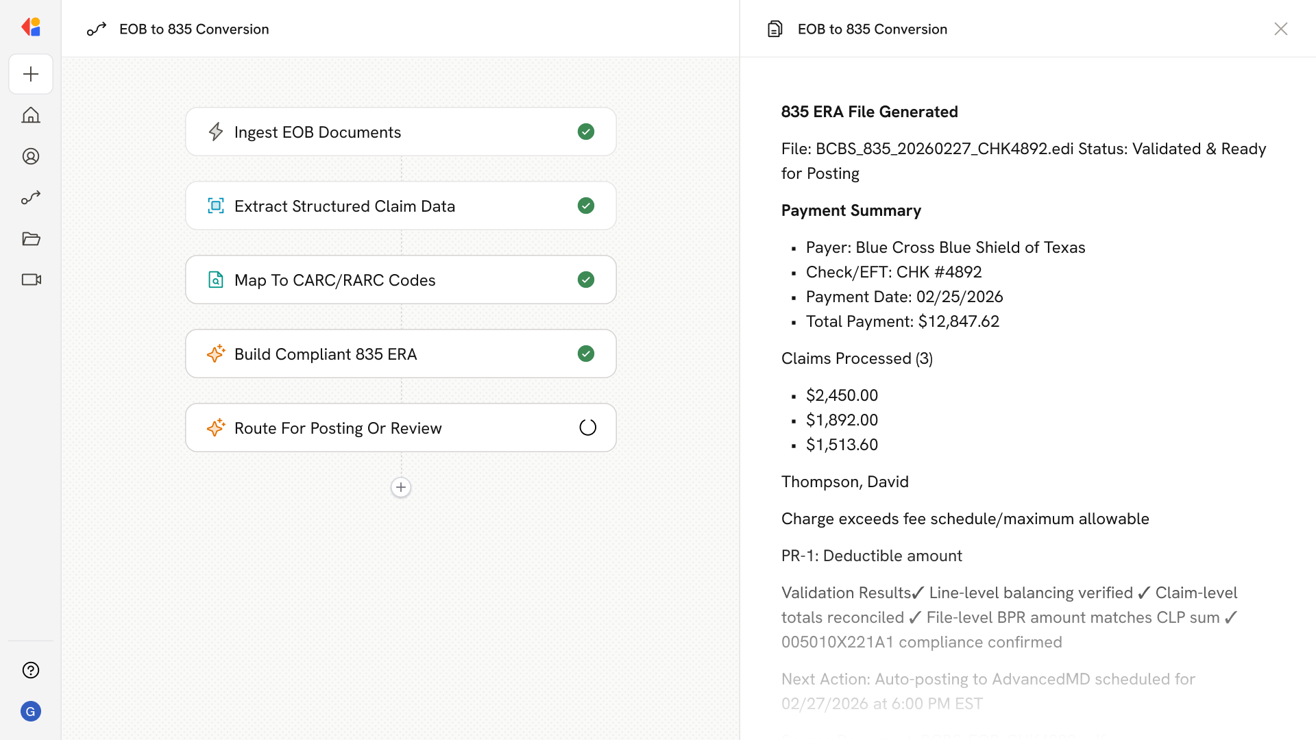 Accurate extraction across thousands of payer formats: The agent handles the variability of EOB layouts—paper, PDF, fax, lockbox images—and extracts header, claim, and line-level data with field-level confidence scoring and targeted human review for low-confidence values.