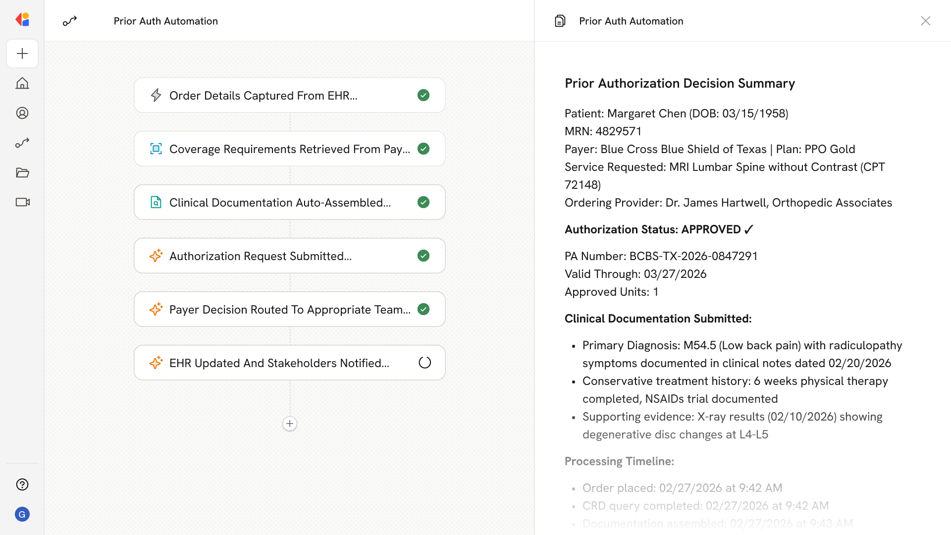 AI-driven forms auto-populate clinical evidence from EHR data—diagnoses, lab results, imaging reports—prompting users only for what's missing and aligning terminology to payer-specific requirements to reduce denials.