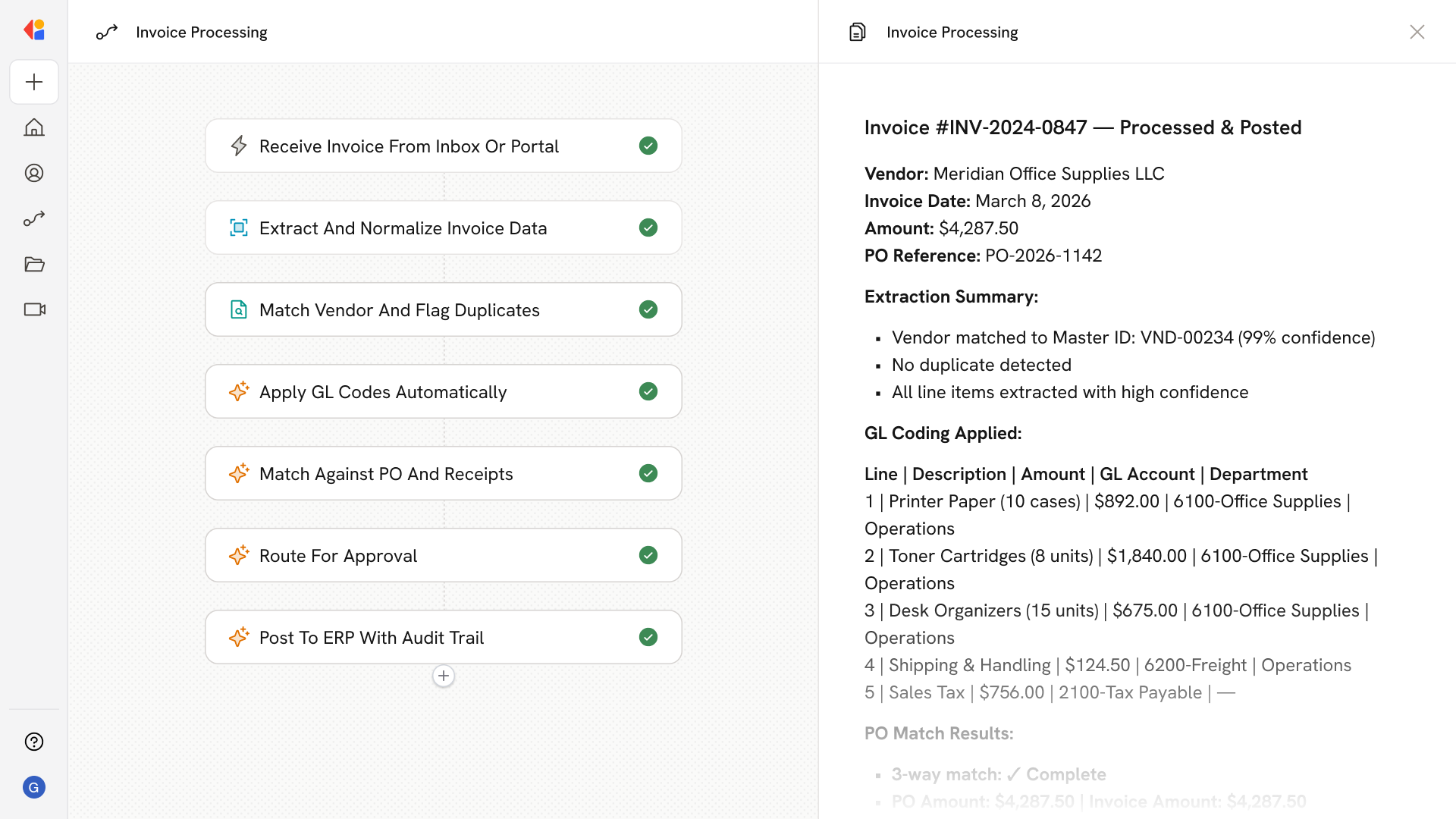 The Workflow cross-references your vendor master using fuzzy matching on legal names, tax IDs, and remit-to addresses, while flagging potential duplicates based on invoice number, amount, and date heuristics.