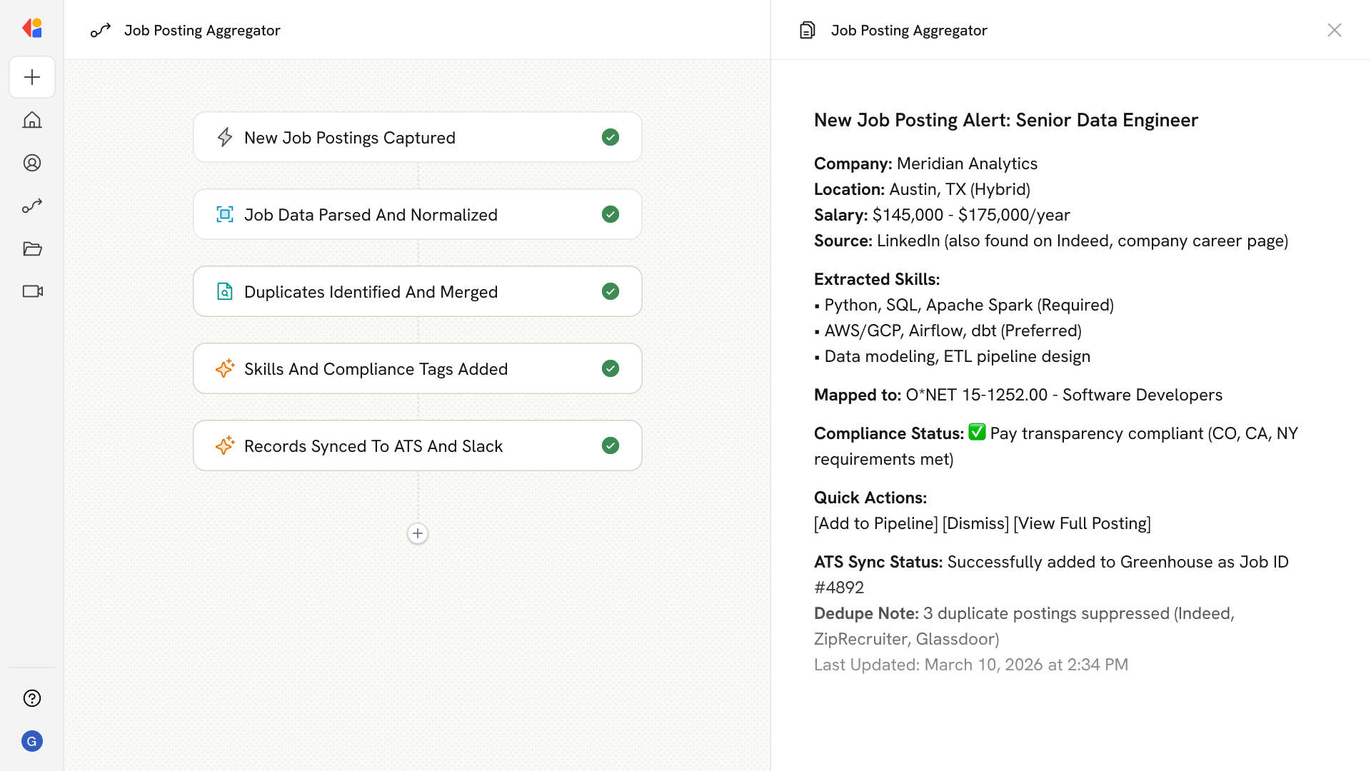 Clean, enriched job records sync to your ATS (Greenhouse, Lever, Workday) via idempotent upserts with custom field mapping, while saved search alerts push rich cards to Slack channels with one-click actions to add or dismiss.
