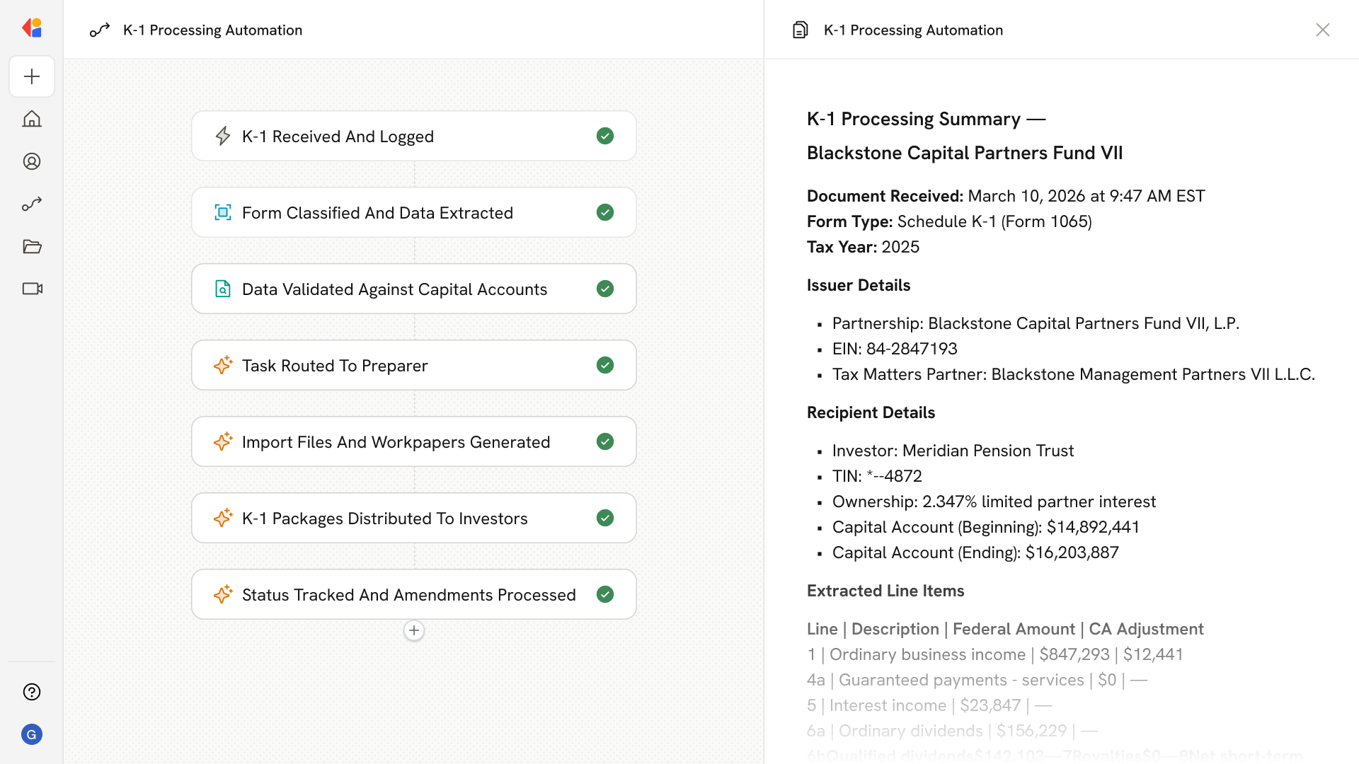 A rules engine matches each K-1 to the correct taxpayer, return type, and jurisdiction workstream, then auto-assigns work items to preparers based on complexity flags, state footprint, and foreign activity indicators.
