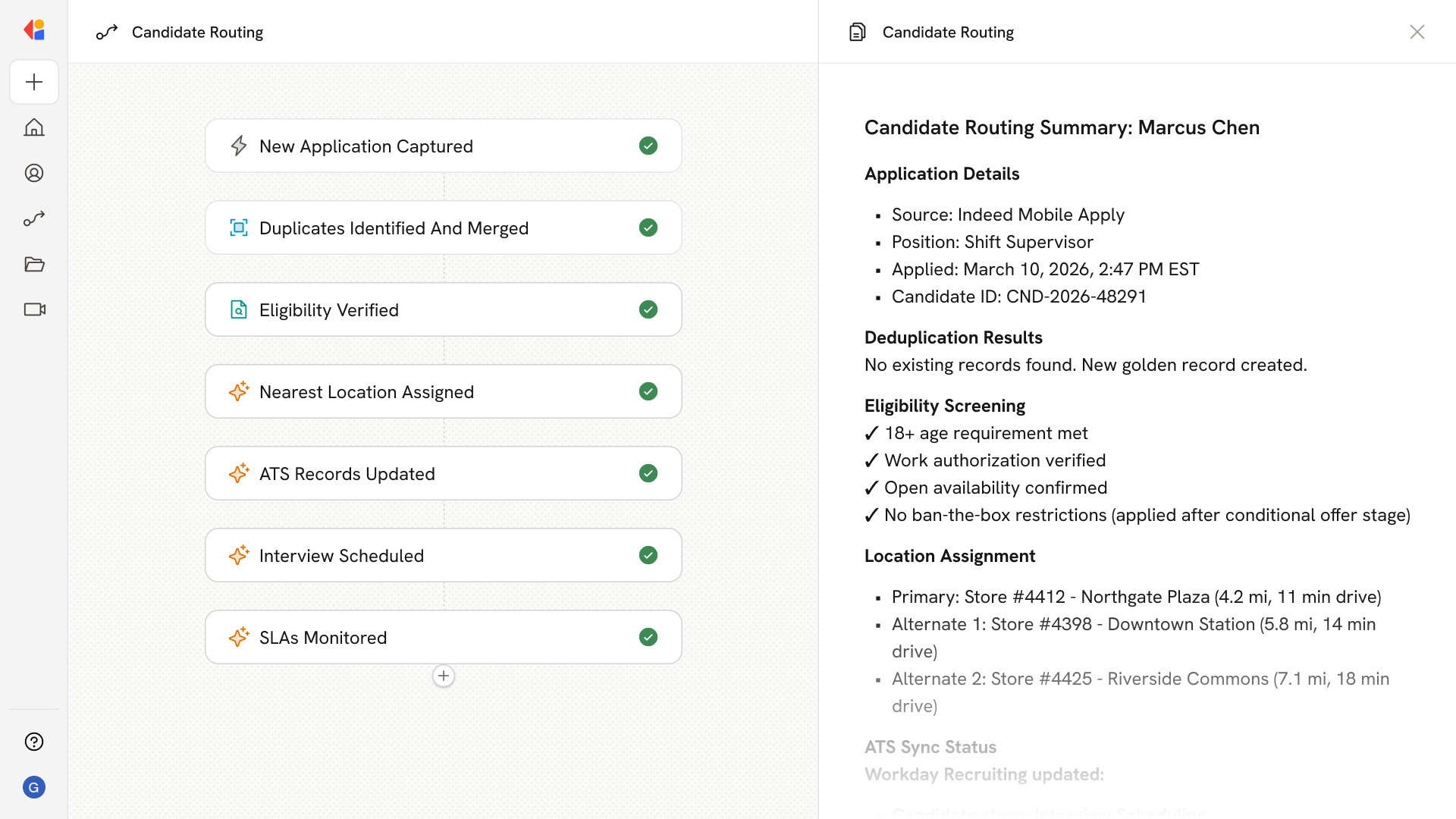 The Workflow activates when a candidate applies through any channel—career site, job board, QR code, text-to-apply, or referral—capturing profile data, geo-coordinates, shift preferences, and consent records.