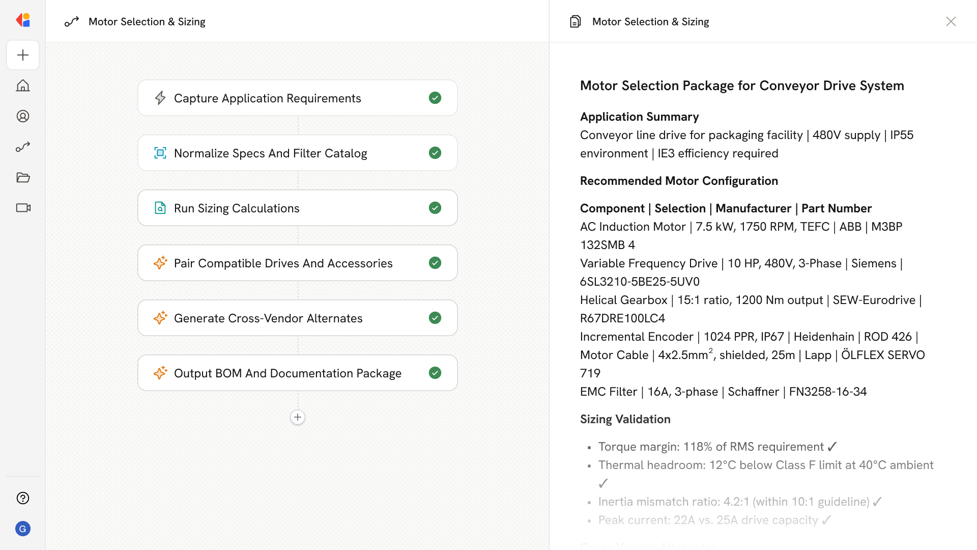 AI automation matches motors with compatible drives, gearboxes, feedback devices, braking components, and EMC filters—encoding voltage, current, and cable-length constraints to eliminate configuration errors and compliance gaps.