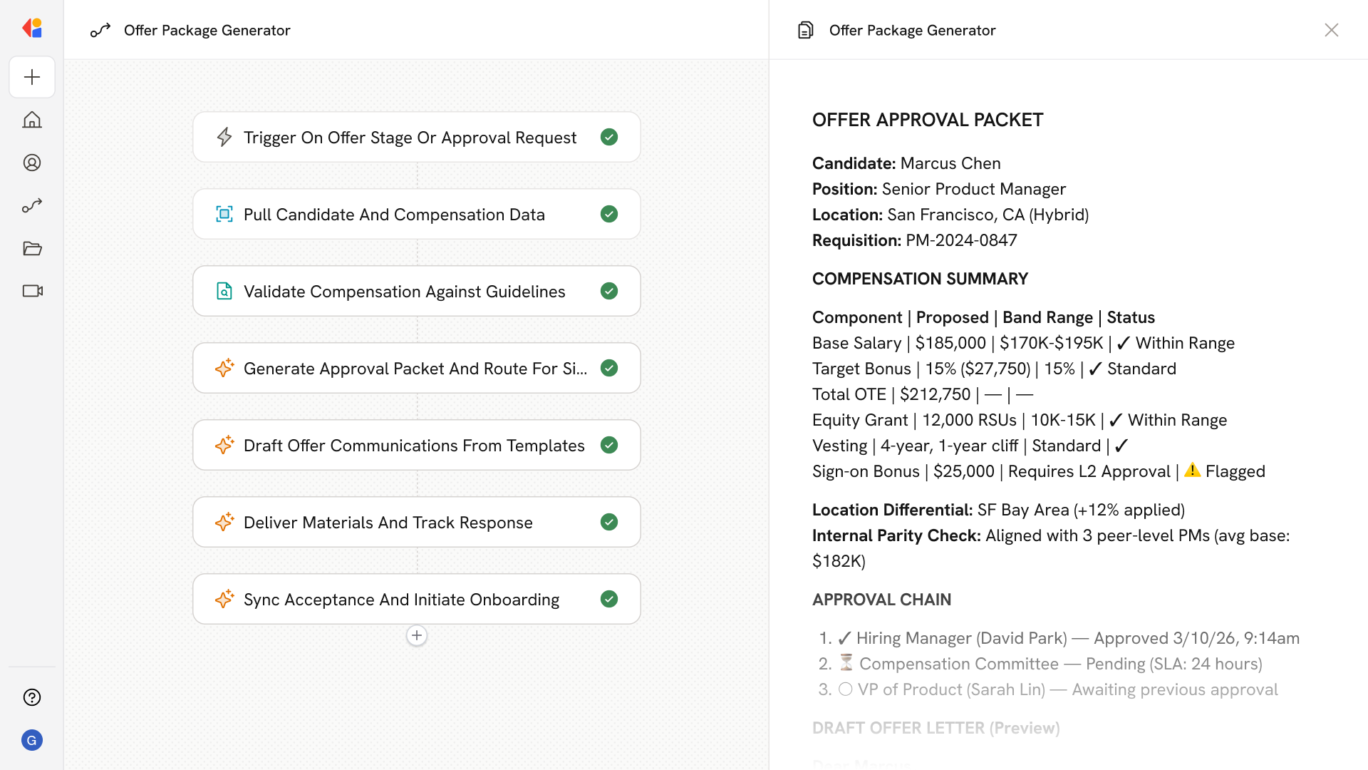 The Workflow checks proposed compensation against band guidelines and internal parity, computes OTE and vesting schedules, and flags any exceptions that require additional approvals—all before drafting begins.