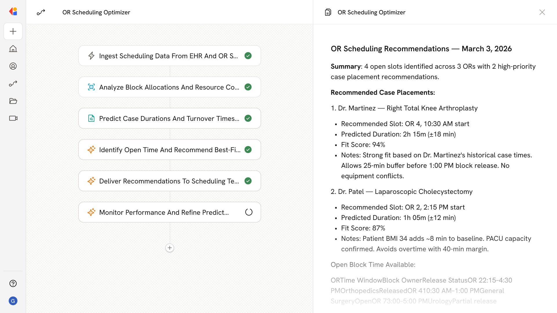 The Workflow surfaces available block time, calculates utilization gaps, and recommends optimal case placements that balance prime-time targets, overtime avoidance, and resource conflicts—complete with fit scores and conflict warnings.