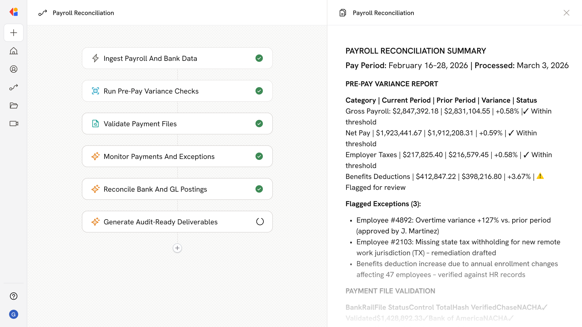 The Workflow matches bank statement debits to expected batches and ties payroll journals to GL accounts, producing a clearing account roll-forward, variance explanations, and a certification checklist ready for controller sign-off.