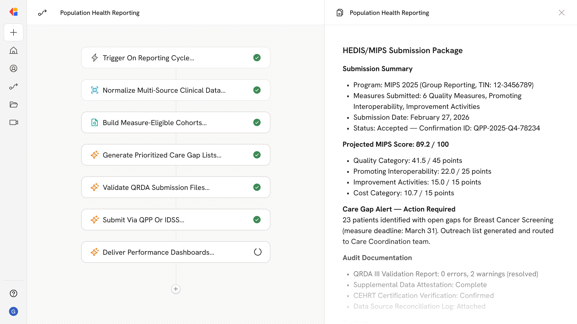 The Workflow runs conformance checks on QRDA III structure, identifiers (TIN, NPI, APM Entity IDs), nullFlavor rules, and CEHRT requirements—flagging errors for Human-in-the-Loop review before finalizing submission packages.