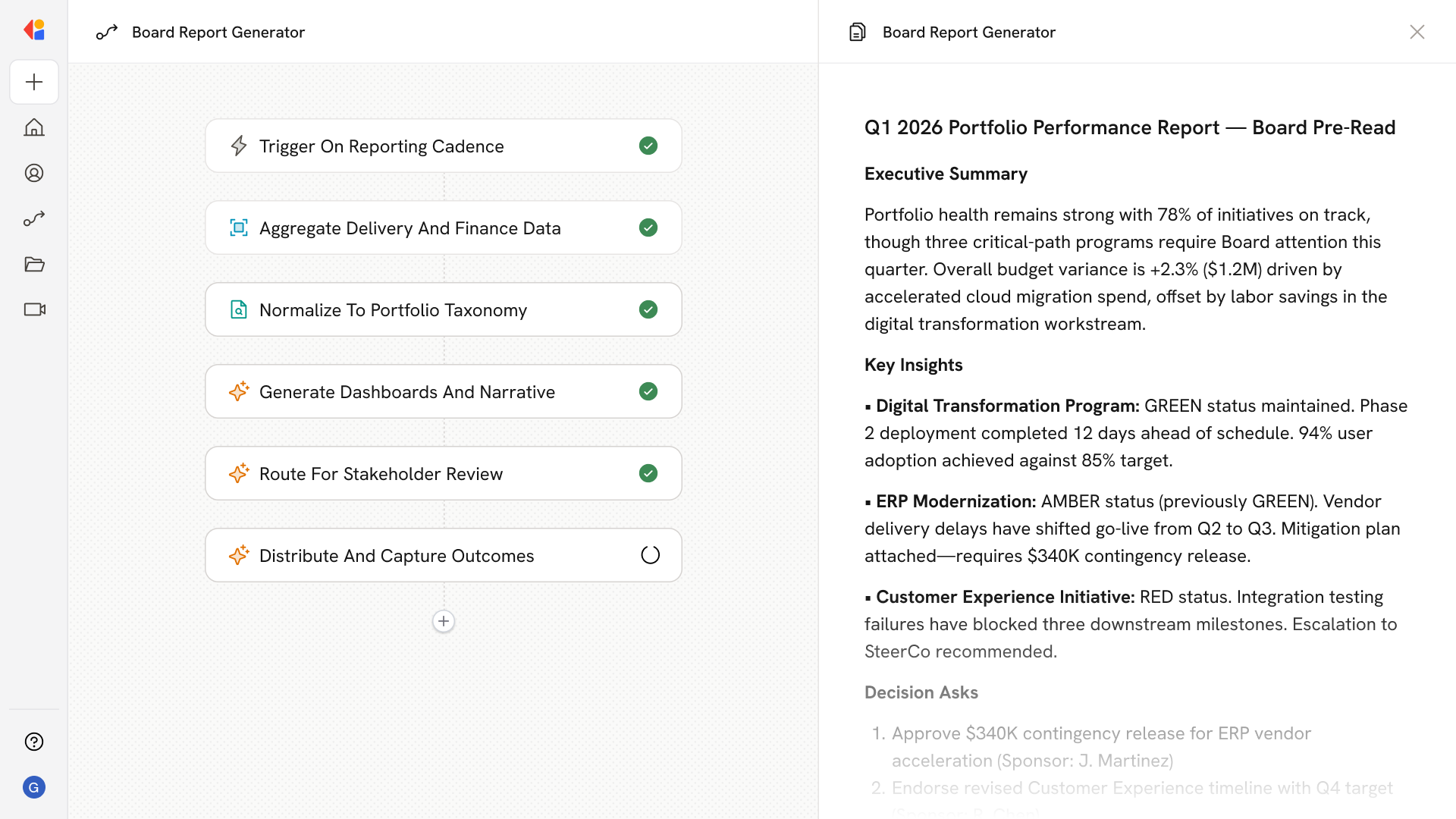 AI synthesizes raw inputs into board-ready artifacts: executive summaries with delta highlights, RAG heatmaps with documented thresholds, milestone roadmaps, budget vs. actuals analysis, and explicit decision askstransforming status dumps into tight executive storylines.
