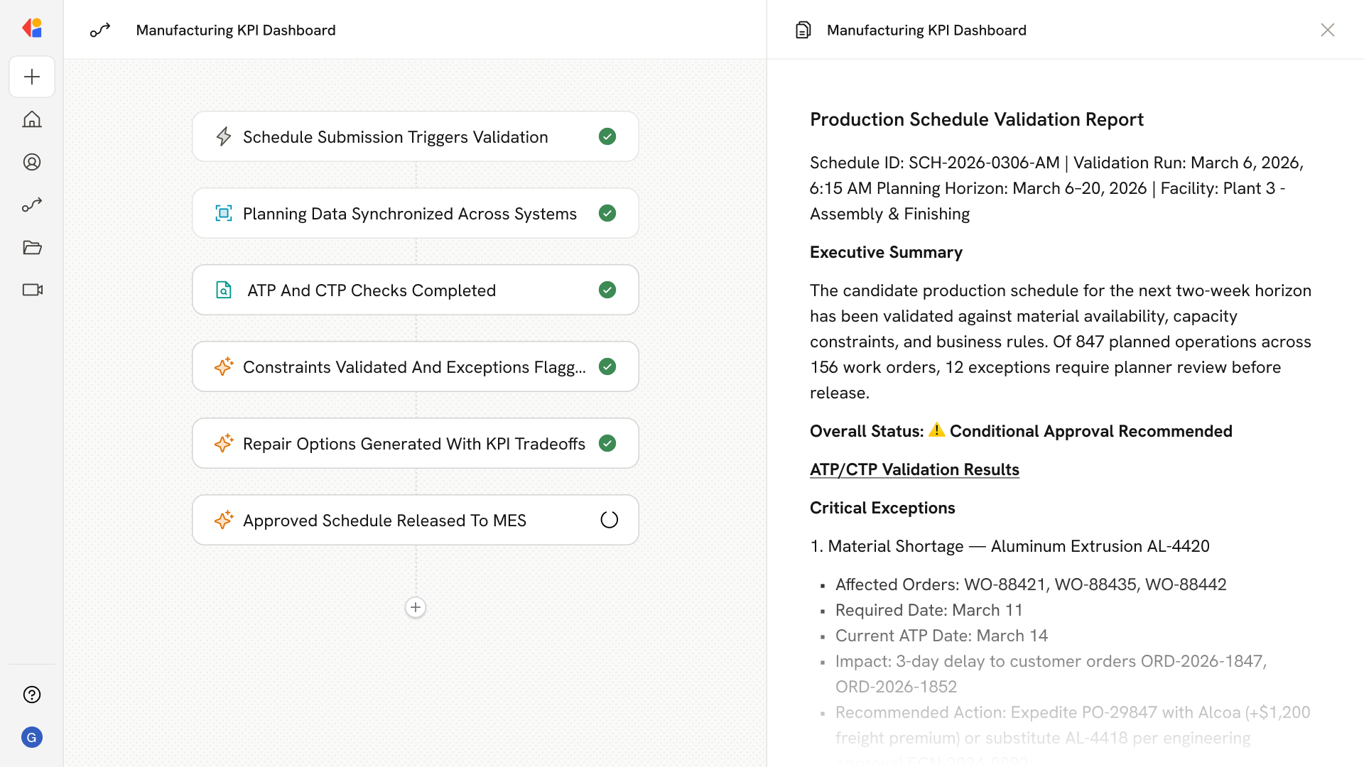 The Workflow activates when a candidate schedule is submitted from your APS, ERP, or MRP system—or runs on a scheduled cadence to validate the latest planning snapshot before release windows.