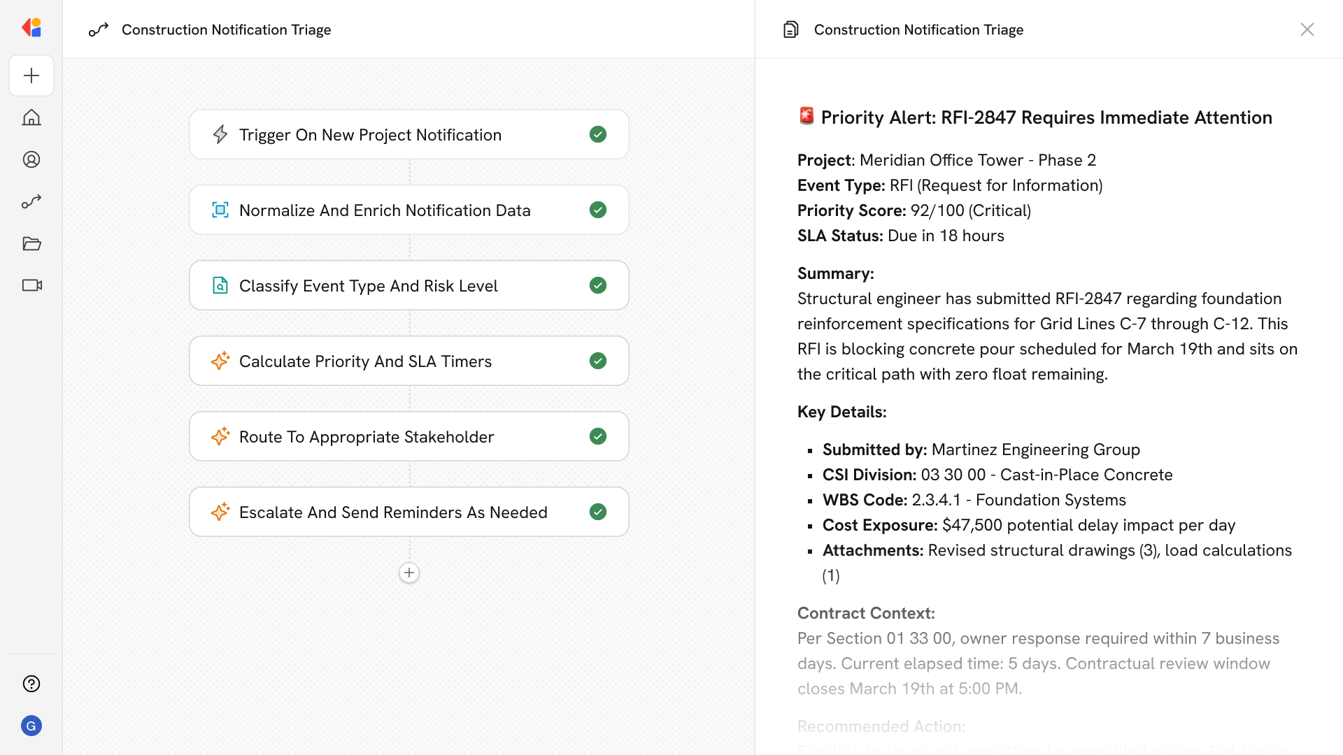 The Workflow activates when a new event arrives—RFI created, submittal status changed, change event opened, safety incident logged, or schedule variance detected—via API webhooks, email parsing, or chat connectors.