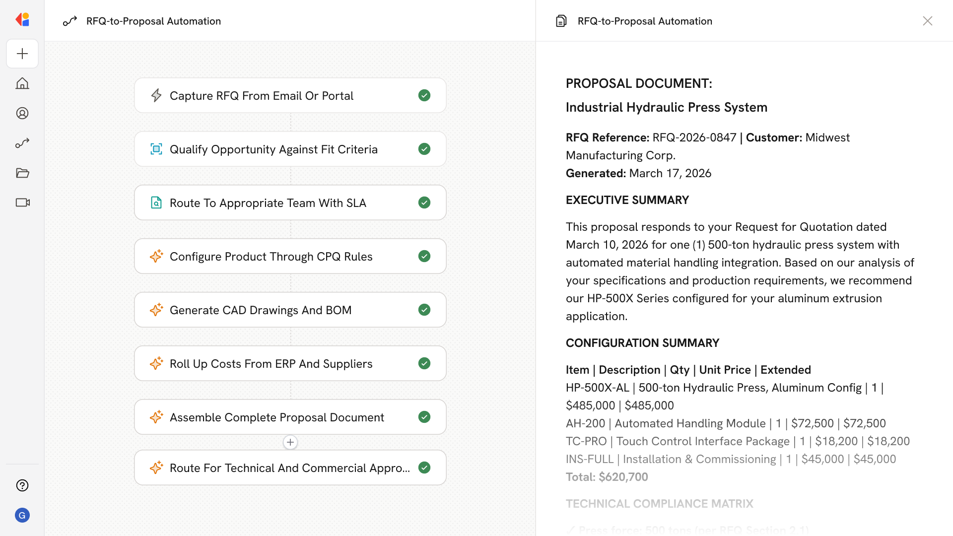 The agent coordinates data flow between CPQ configurators, CAD automation tools, ERP cost systems, and CRM opportunities—so engineering, sales, and operations work from a single source of truth without rekeying data or chasing version mismatches.