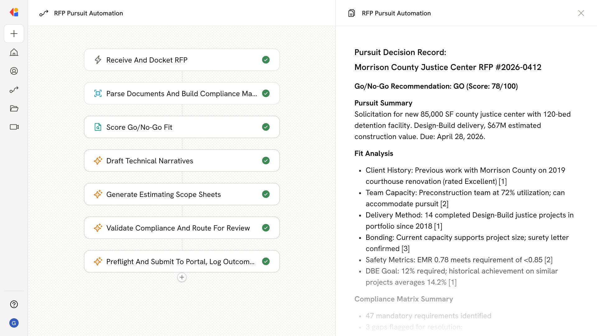 The Workflow pulls from your Knowledge Base to score pursuit fit against client history, team capacity, delivery method experience, bonding requirements, safety metrics, and DBE/MBE goals—surfacing a structured decision record for leadership.