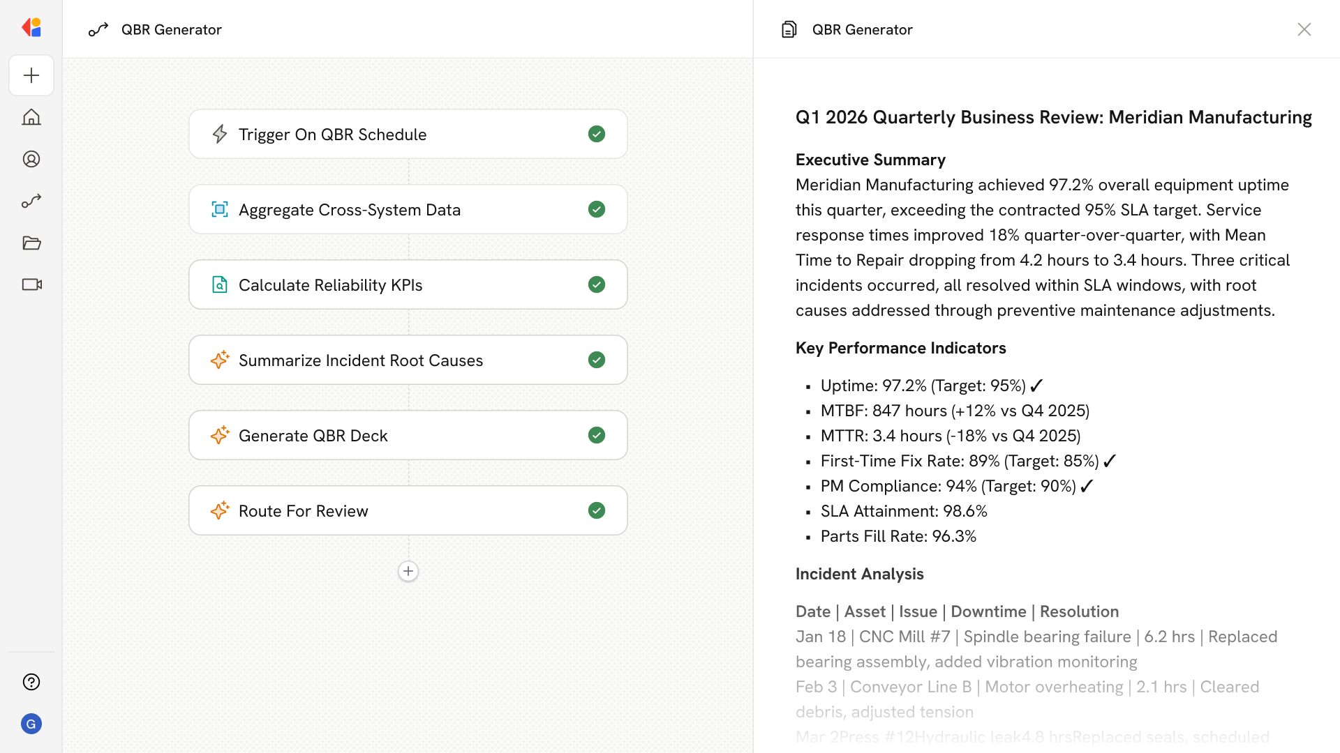 The Workflow produces an executive summary, KPI scorecards with trend comparisons, incident pages, maintenance recommendations, and a forward roadmap—exported to your branded PowerPoint or PDF template.