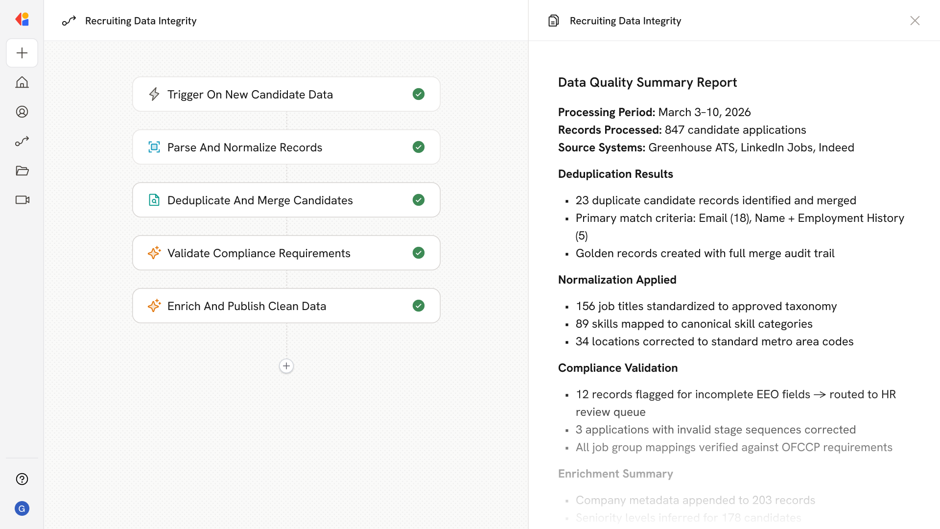 Automated data quality rules check for missing EEO fields, invalid stage sequences, and broken source attribution—quarantining suspect records and alerting data stewards before issues reach your dashboards.