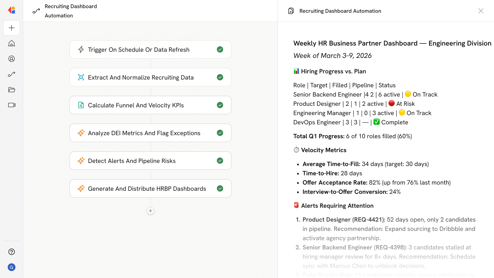 Automated workflows calculate funnel conversion rates, time-to-fill metrics, and recruiter productivity while flagging SLA breaches, thin pipelines, and aging reqs before they become problems.
