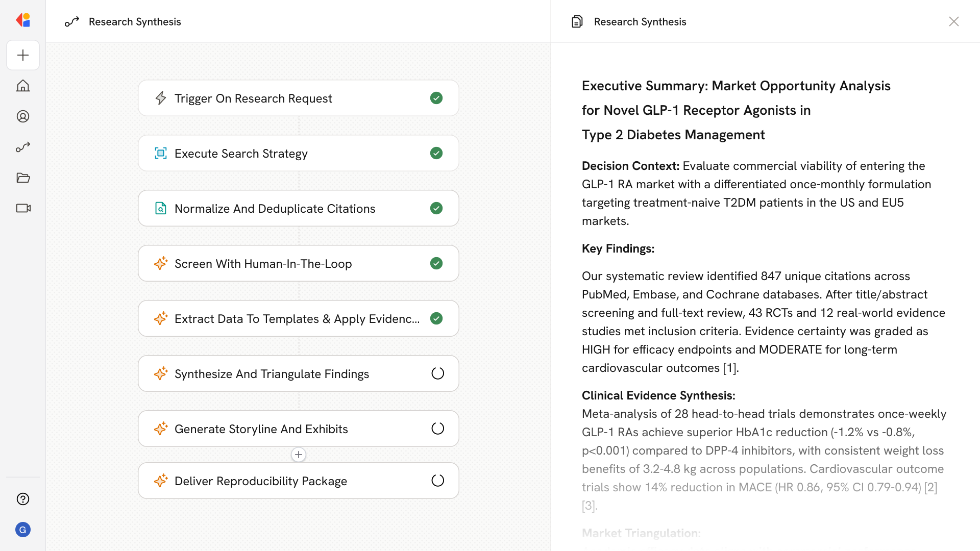 The Workflow clusters themes, calculates effect sizes where applicable, and triangulates academic findings against market data and expert inputs—reconciling deltas and building clean-sheet models for TAM/SAM/SOM or cohort analyses.