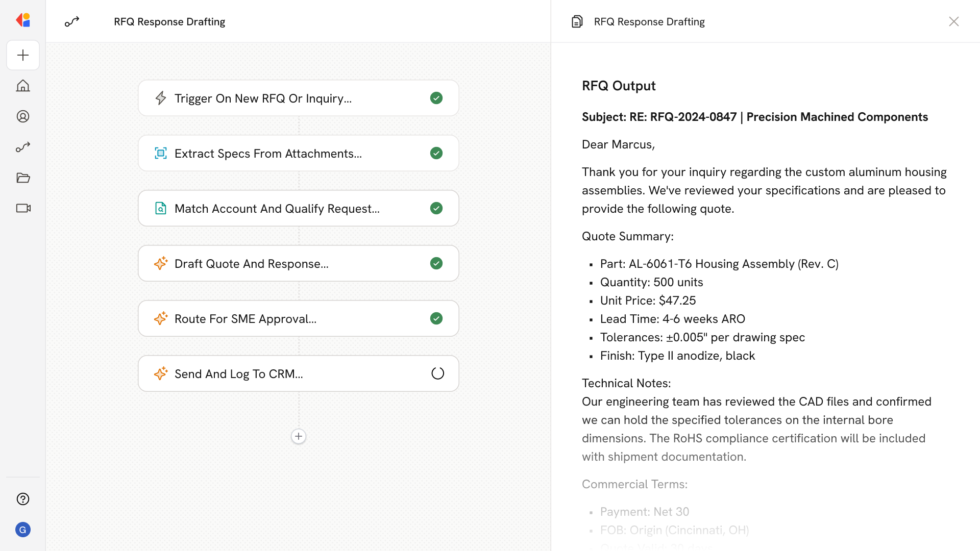 The agent cross-references CRM data to identify the account and contact, checks for NDAs or export control flags, and runs a feasibility screen against your capabilities—surfacing disqualifiers, MOQs, certifications needed, and routing priority.