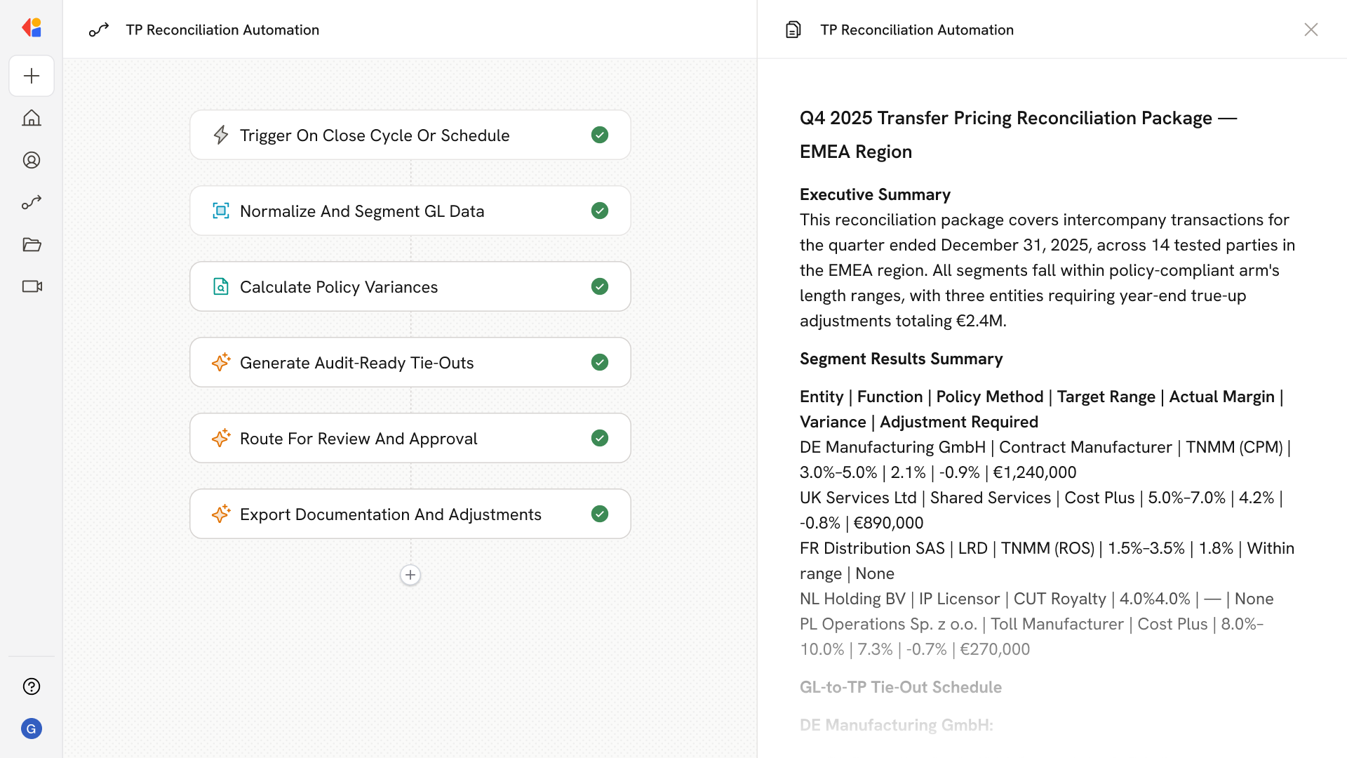 The system generates complete tie-out packs—GL-to-segment reconciliations, allocation key documentation, benefit test evidence, and Local File appendices—ready for TP audits, CAP reviews, and regulatory filings.