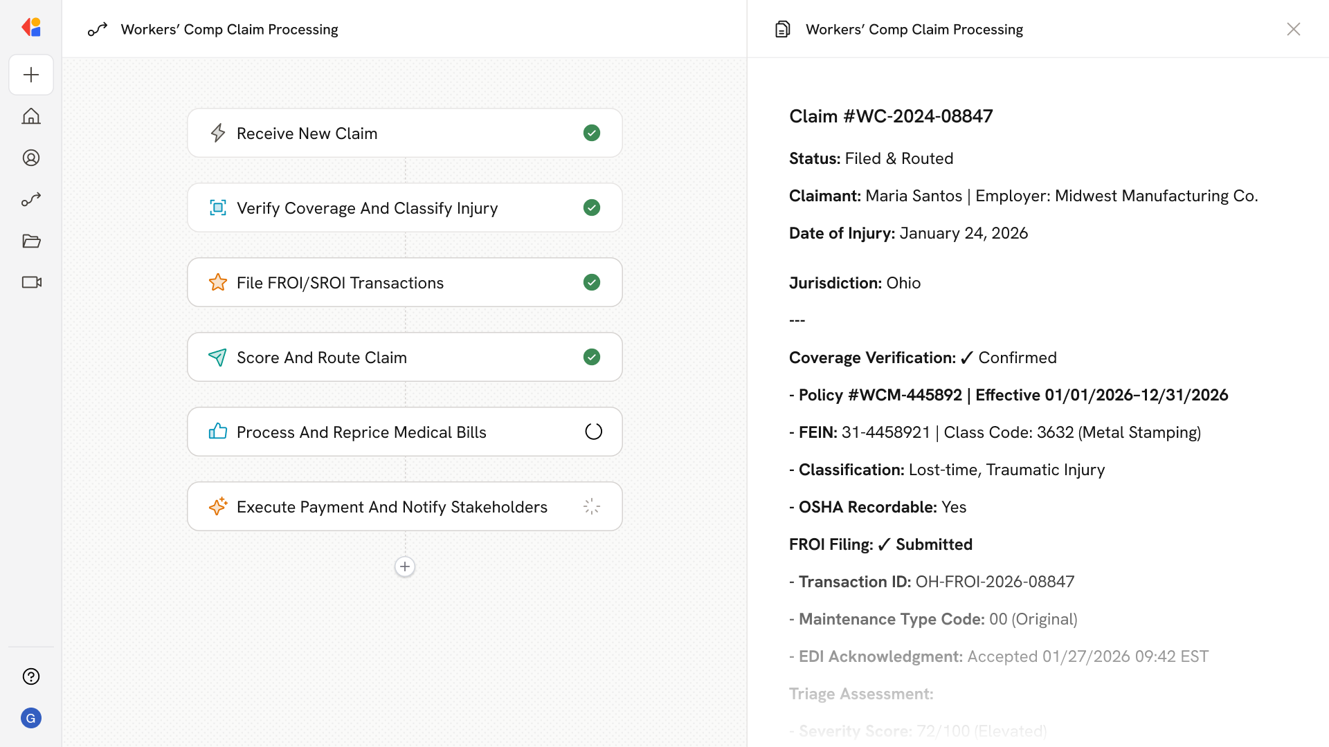 AI automation captures claim data from any channel—portals, calls, email, or fax—validates coverage, classifies the event, and files FROI/SROI transactions per IAIABC R3.1 specifications with automatic error handling and resubmission.